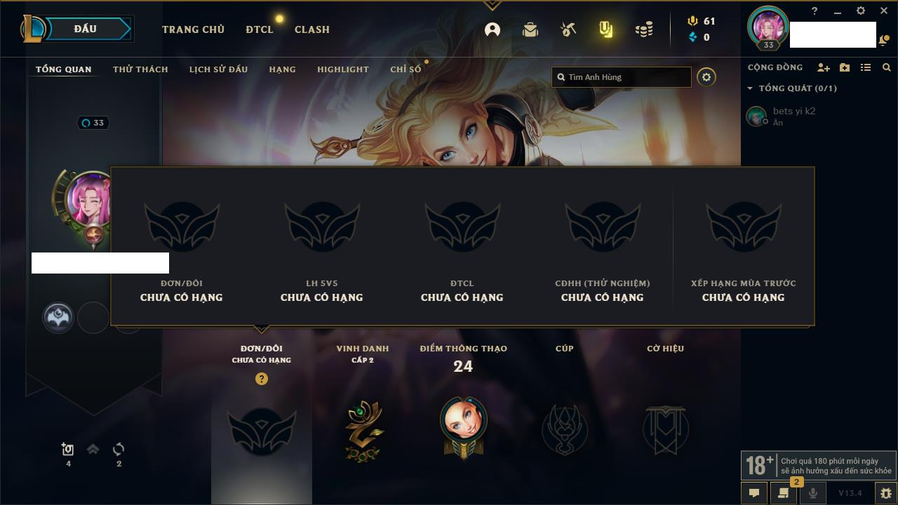 Rank Đơn: Vàng IVKhung: VàngTướng: 171 - Còn 48721 THXTrang Phục: 171Rank ĐTCL: Chưa RankLinh Thú: 27