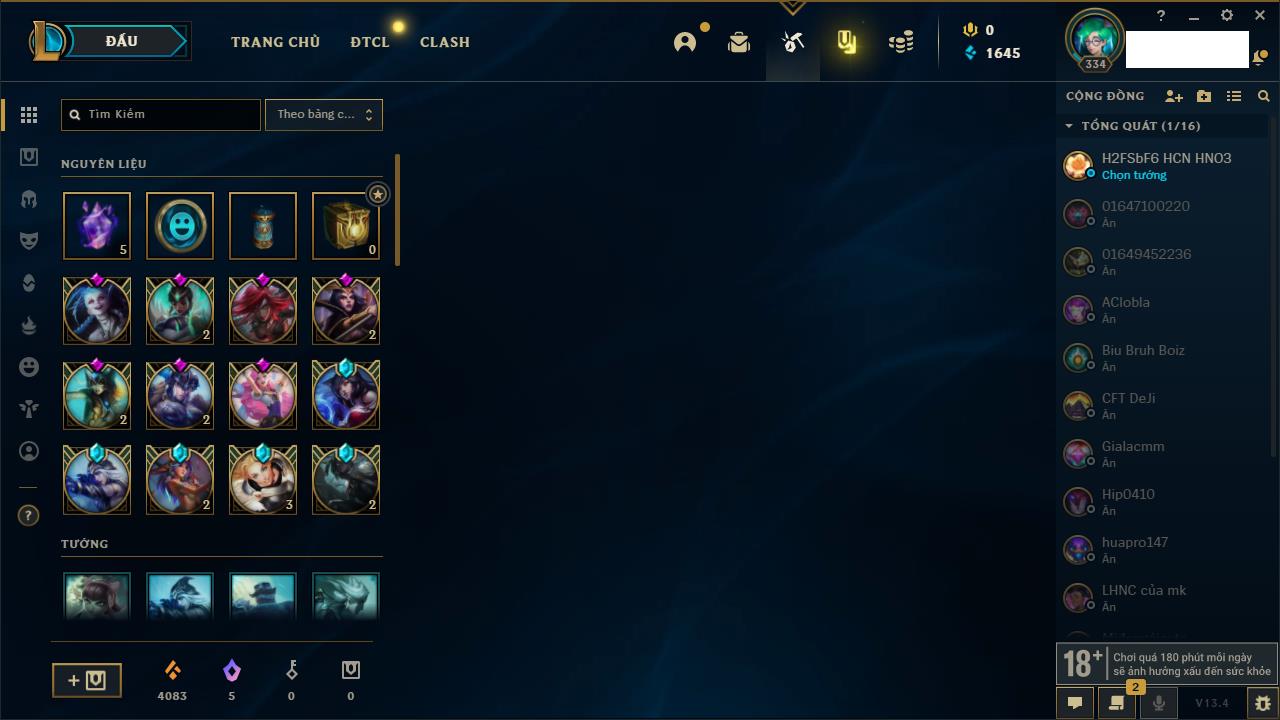 Rank Đơn: Bạc IVKhung: VàngTướng: 172 - Còn 358384 THXTrang Phục: 177Rank ĐTCL: Lục Bảo IILinh Thú: 211