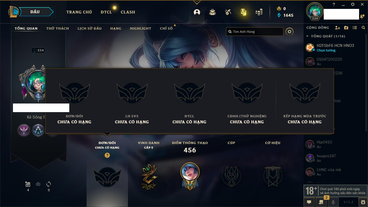 Rank Đơn: Bạc IIKhung: VàngTướng: 171 - Còn 332462 THXTrang Phục: 165Rank ĐTCL: Kim Cương IVLinh Thú: 181