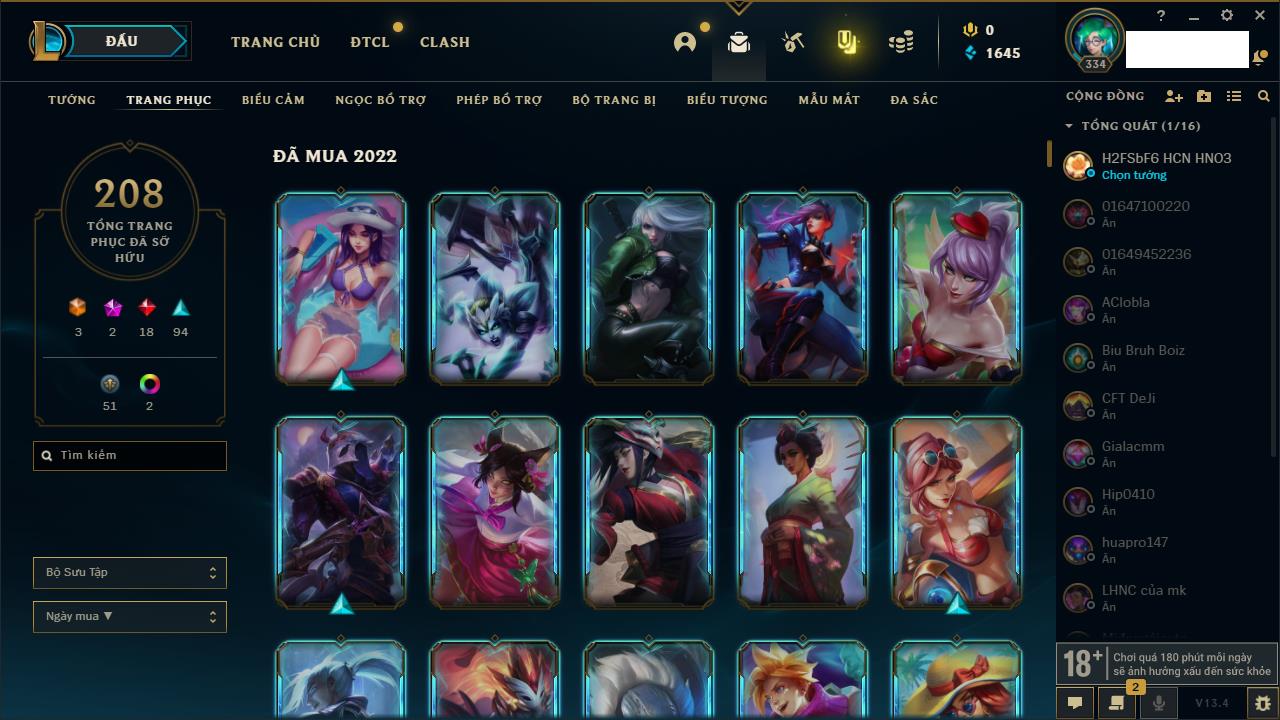 Rank Đơn: Vàng IVKhung: VàngTướng: 171 - Còn 48721 THXTrang Phục: 171Rank ĐTCL: Chưa RankLinh Thú: 27