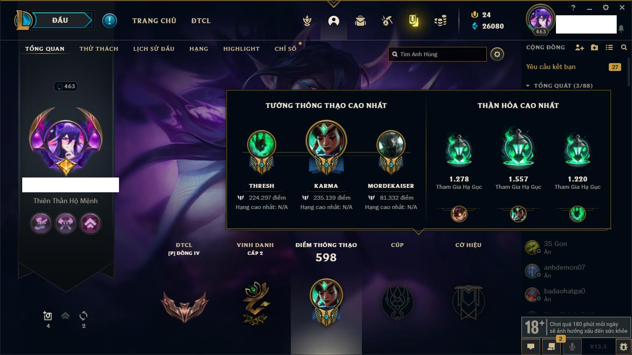 Rank Đơn: Vàng IIKhung: Chưa có khungTướng: 172 - Còn 18252 THXTrang Phục: 266Rank ĐTCL: Chưa RankLinh Thú: 79