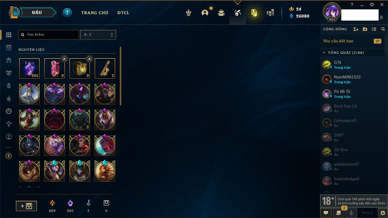 Rank Đơn: Vàng IIKhung: VàngTướng: 171 - Còn 34018 THXTrang Phục: 250Rank ĐTCL: Sắt IILinh Thú: 19