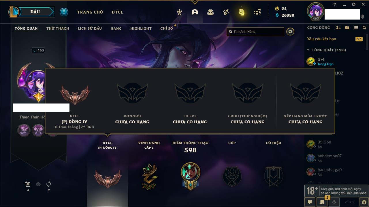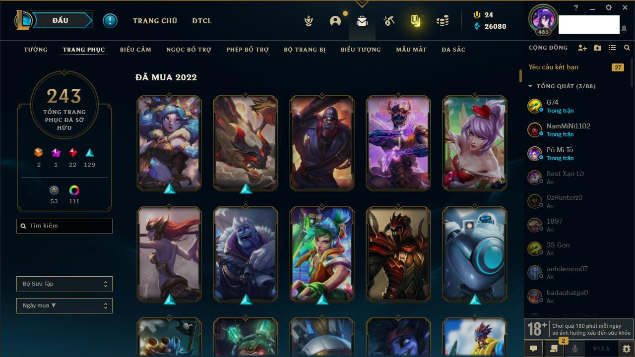 Rank Đơn: Vàng IKhung: Bạch kimTướng: 172 - Còn 108407 THXTrang Phục: 237Rank ĐTCL: Chưa RankLinh Thú: 44