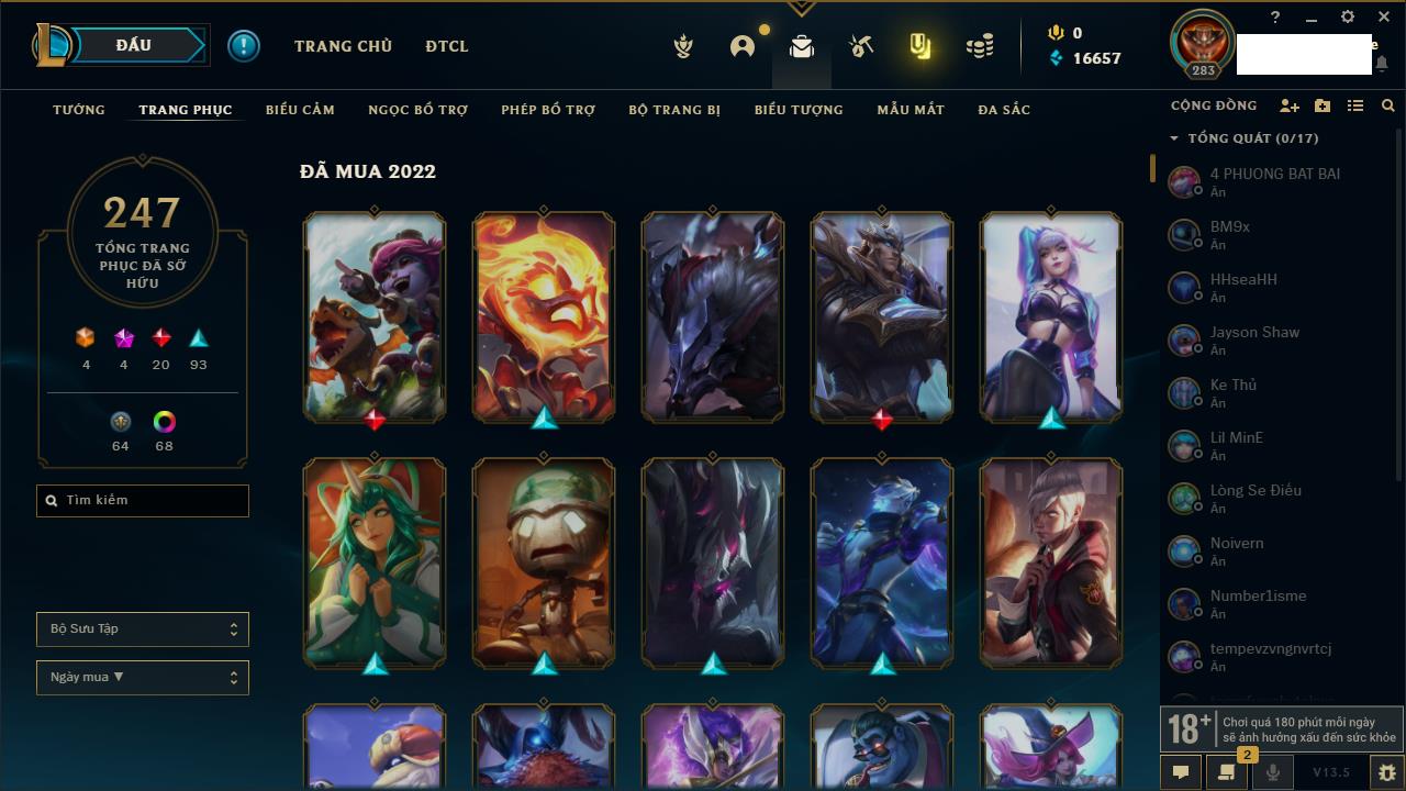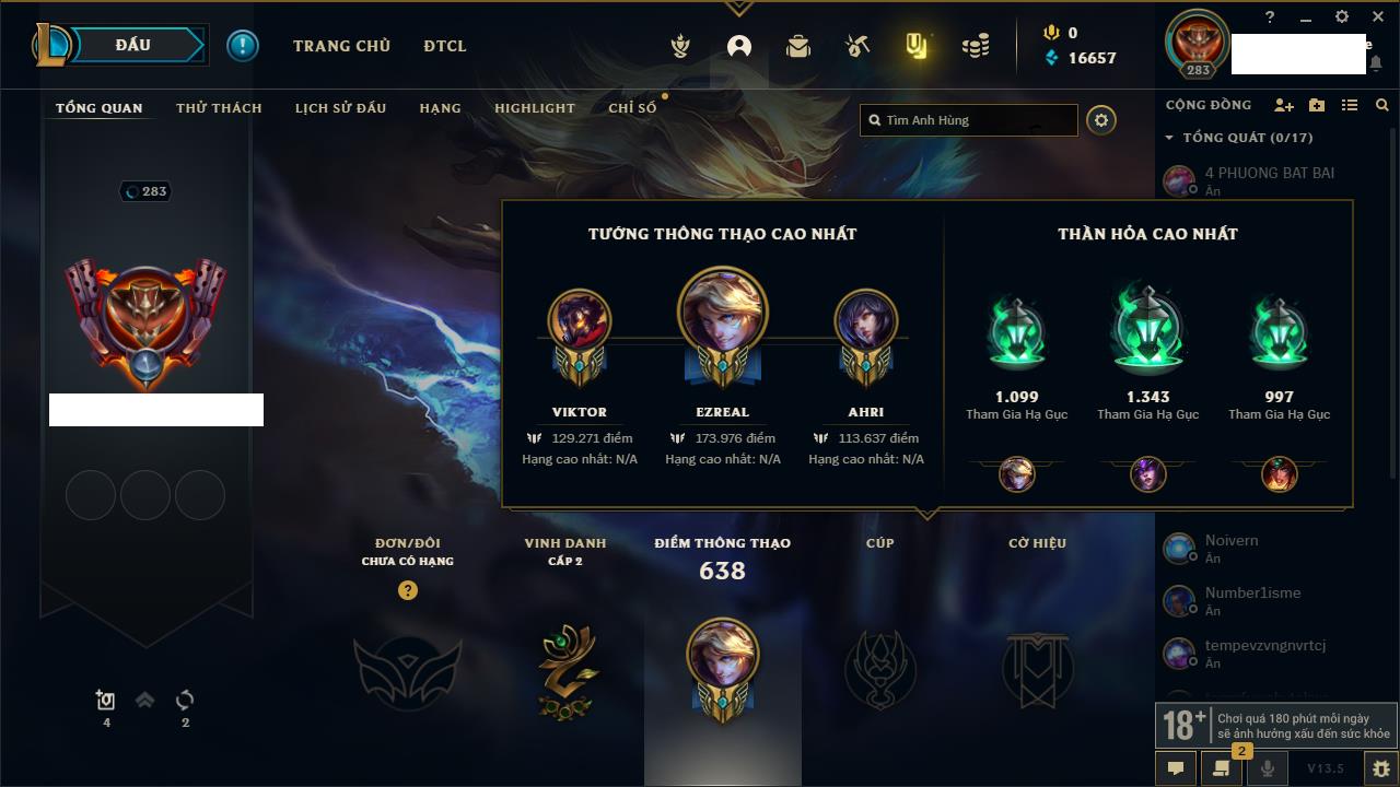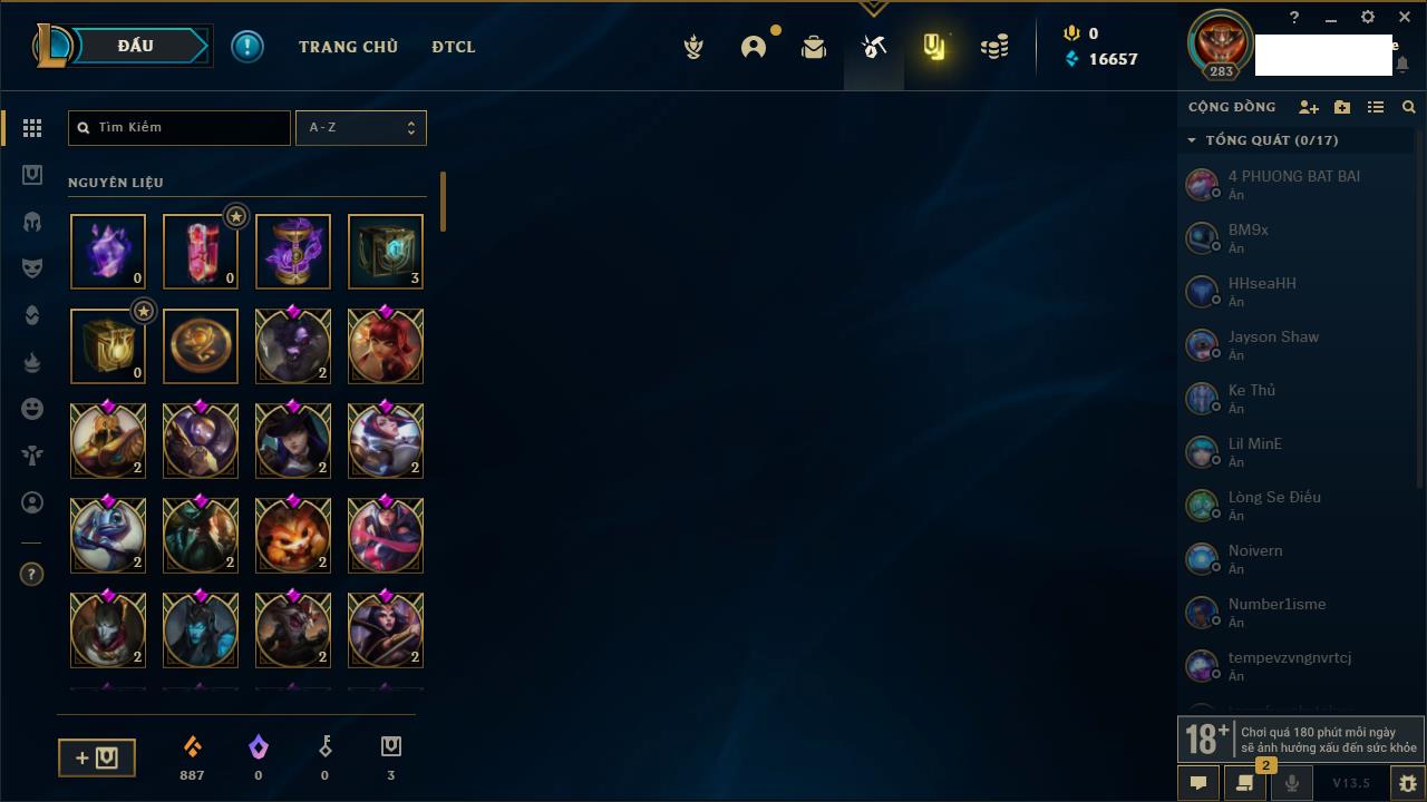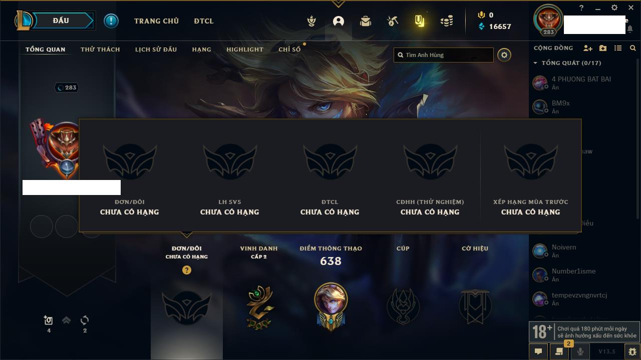 Rank Đơn: Bạc IIIKhung: BạcTướng: 171 - Còn 51045 THXTrang Phục: 220Rank ĐTCL: Sắt IILinh Thú: 141