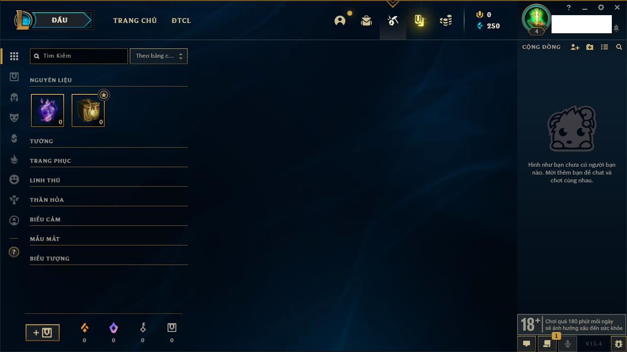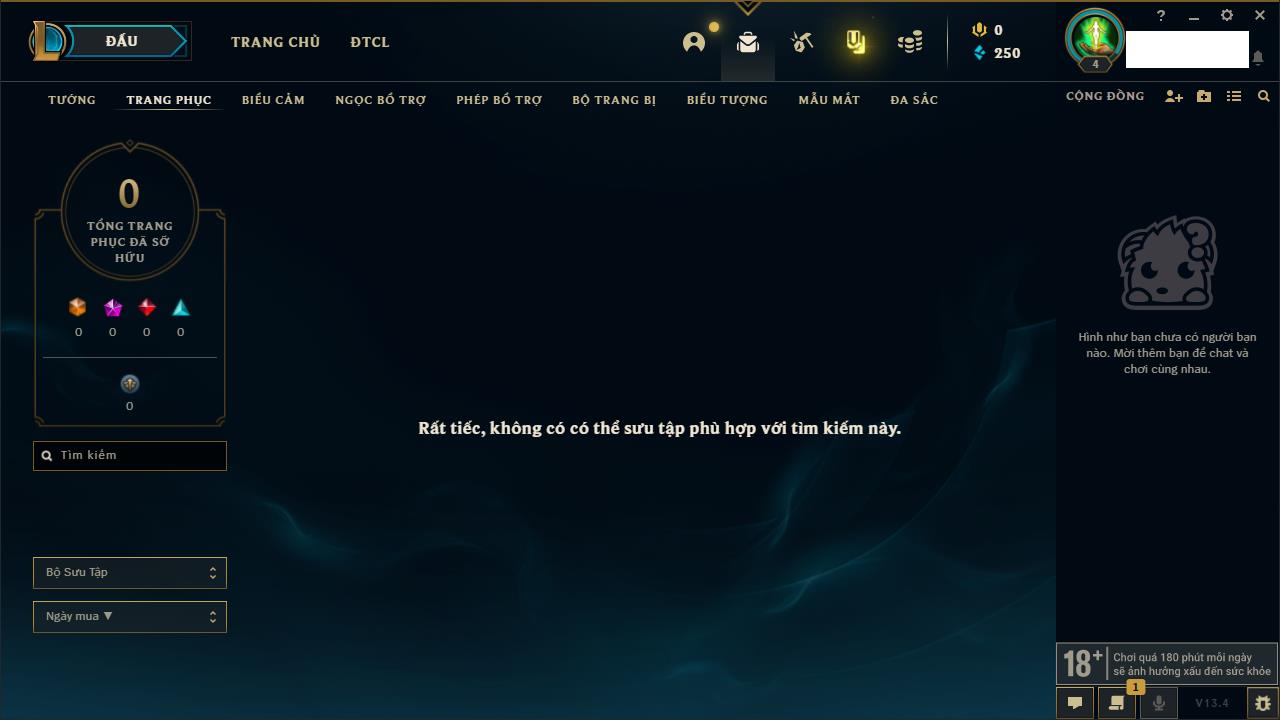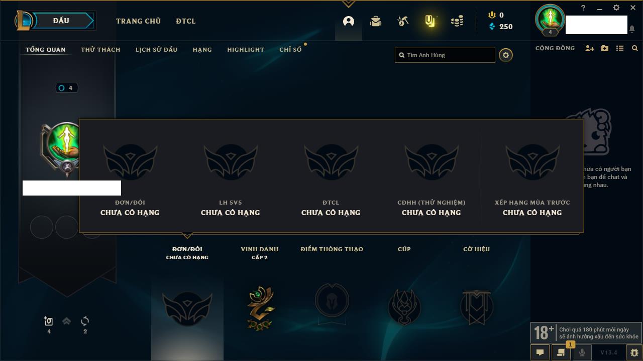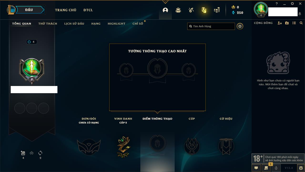 Rank Đơn: Chưa RankKhung: Chưa có khungTướng: 0 - Còn 0 THXTrang Phục: 0Rank ĐTCL: Chưa RankLinh Thú: 4
