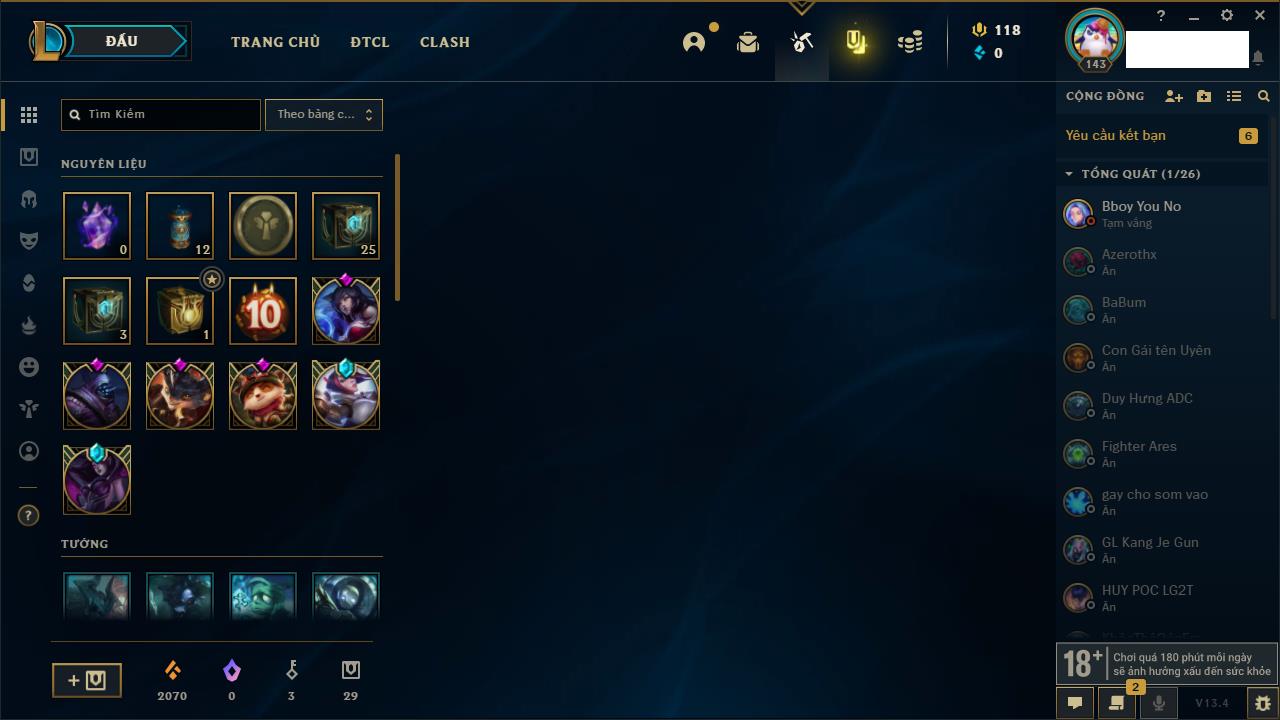 Rank Đơn: Bạc IIIKhung: BạcTướng: 171 - Còn 190352 THXTrang Phục: 260Rank ĐTCL: Sắt IILinh Thú: 31