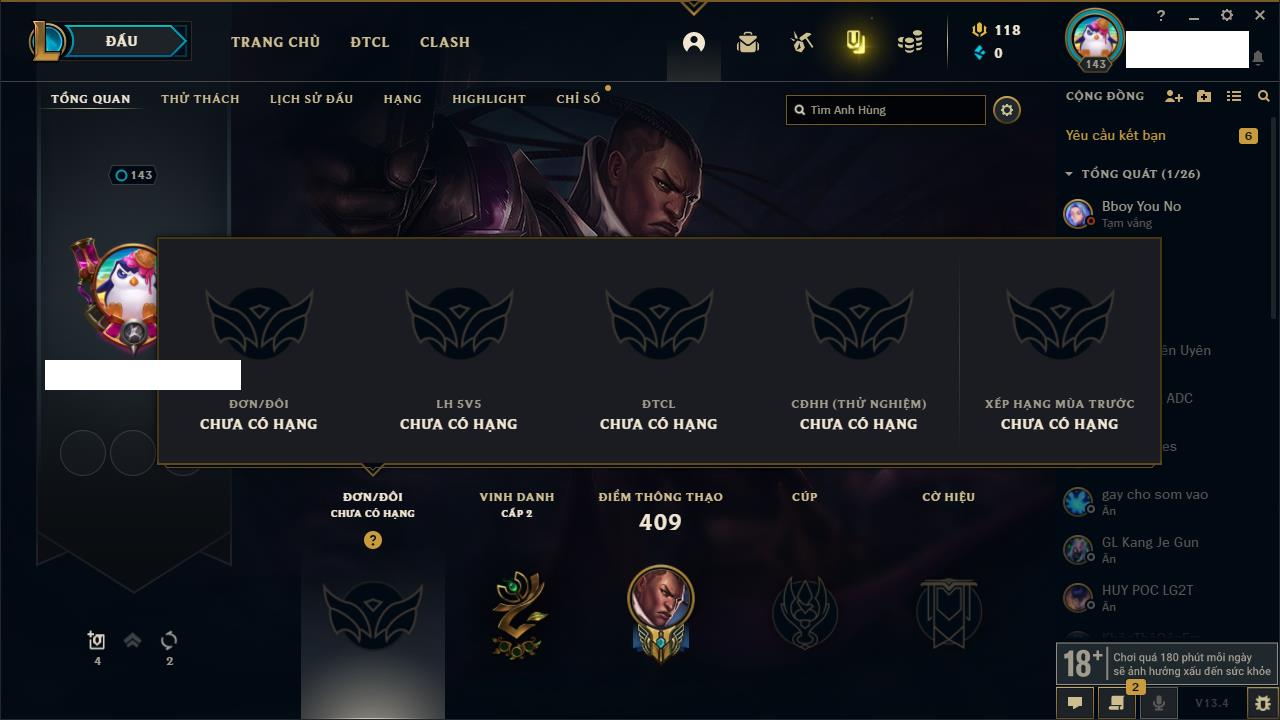Rank Đơn: Bạch Kim IIIKhung: Bạch kimTướng: 171 - Còn 136108 THXTrang Phục: 261Rank ĐTCL: Bạc IVLinh Thú: 73