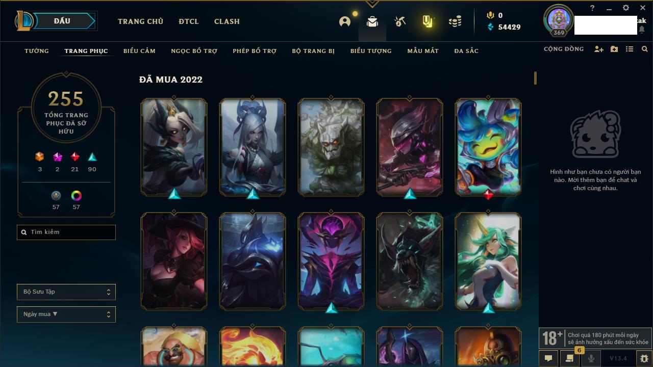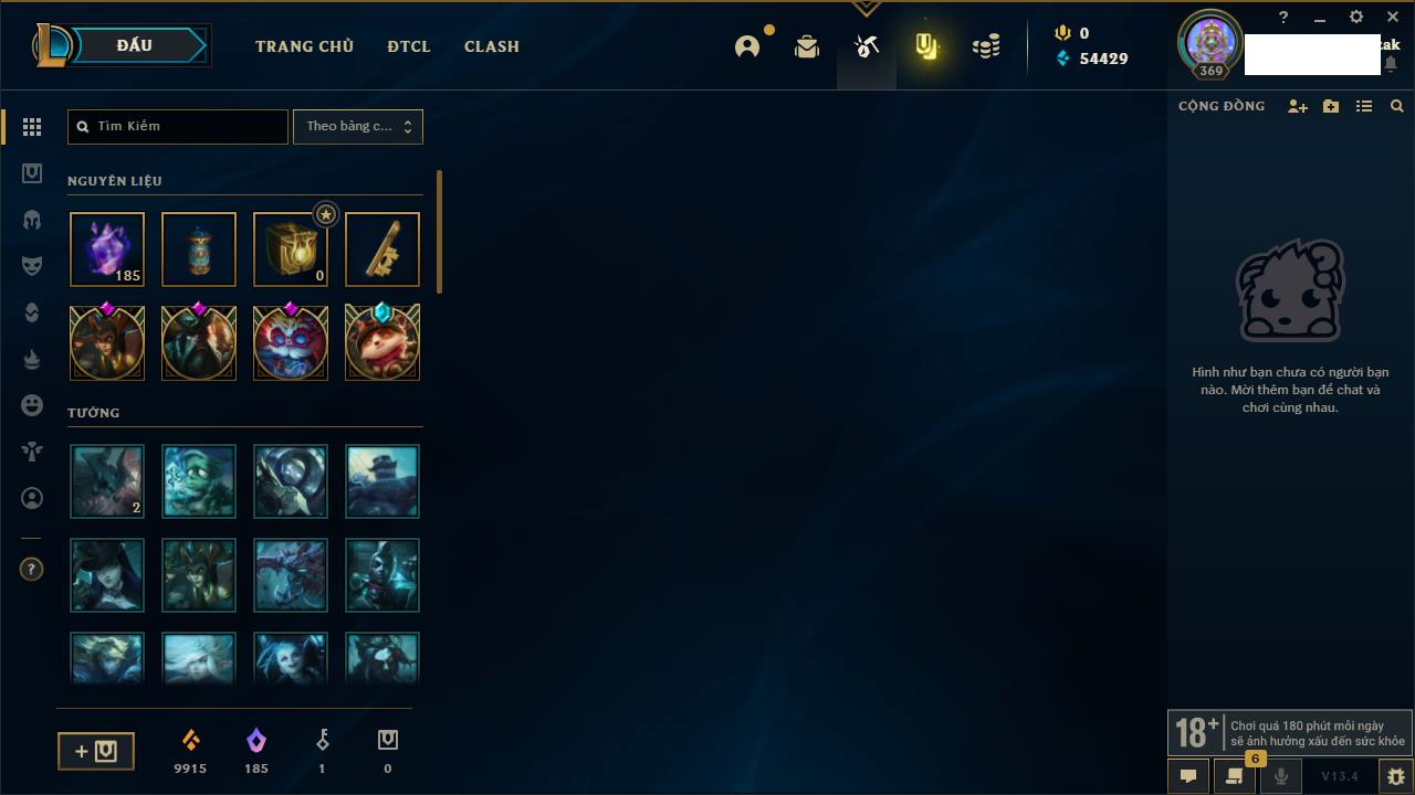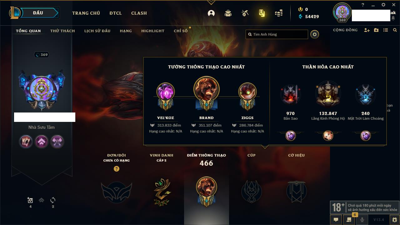 Rank Đơn: Bạc IIKhung: Bạch kimTướng: 169 - Còn 81813 THXTrang Phục: 301Rank ĐTCL: Chưa RankLinh Thú: 140