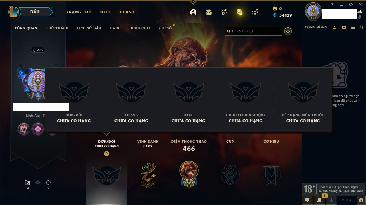 Rank Đơn: Chưa RankKhung: Chưa có khungTướng: 165 - Còn 1609 THXTrang Phục: 25Rank ĐTCL: Chưa RankLinh Thú: 44