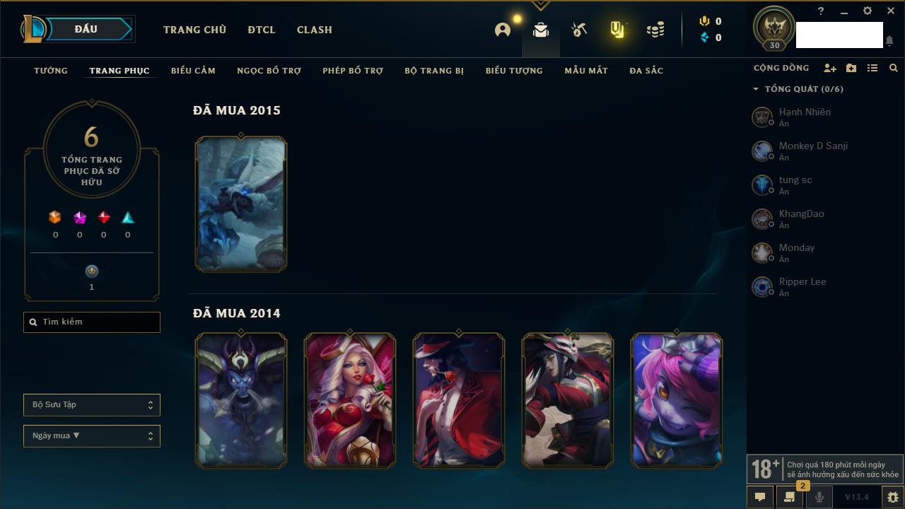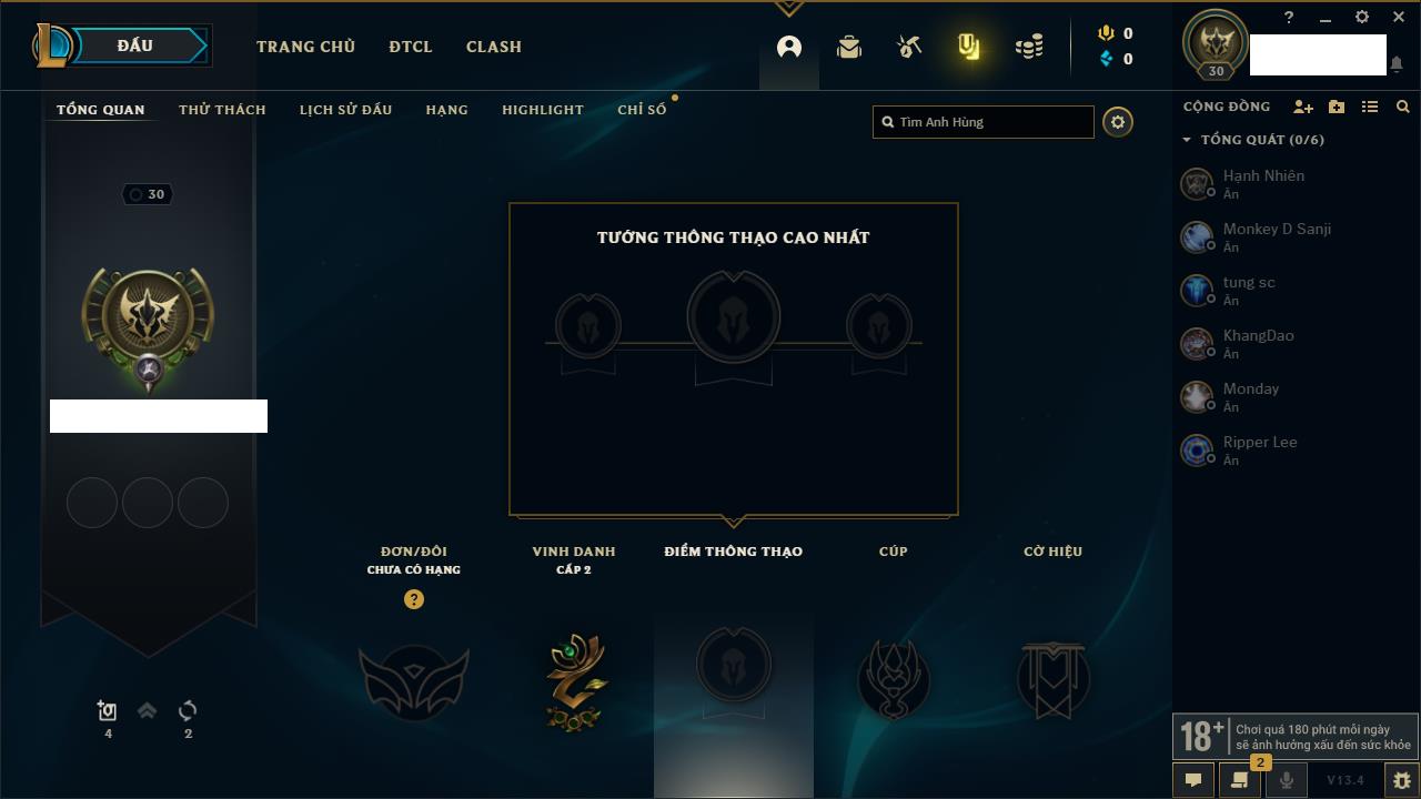 Rank Đơn: Sắt IIIKhung: Chưa có khungTướng: 49 - Còn 11000 THXTrang Phục: 6Rank ĐTCL: Chưa RankLinh Thú: 131
