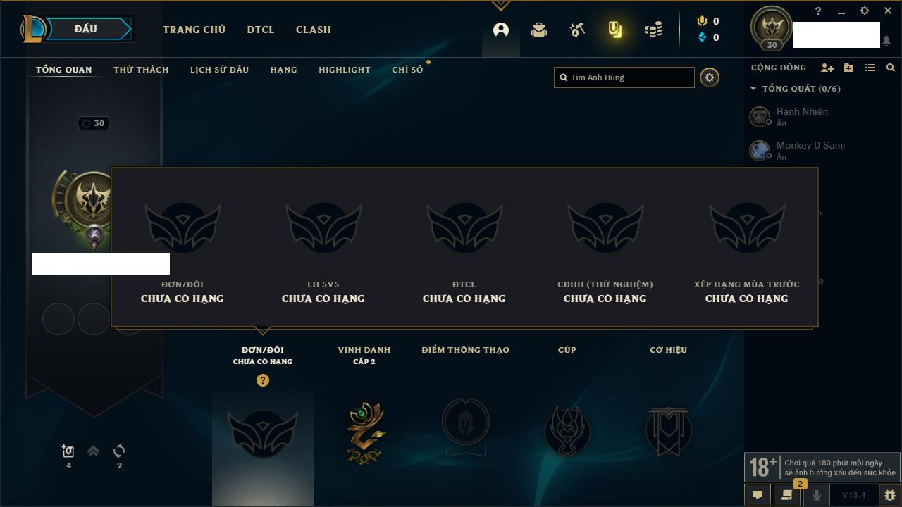 Rank Đơn: Đồng IIIKhung: Chưa có khungTướng: 86 - Còn 14367 THXTrang Phục: 19Rank ĐTCL: Vàng IIILinh Thú: 95