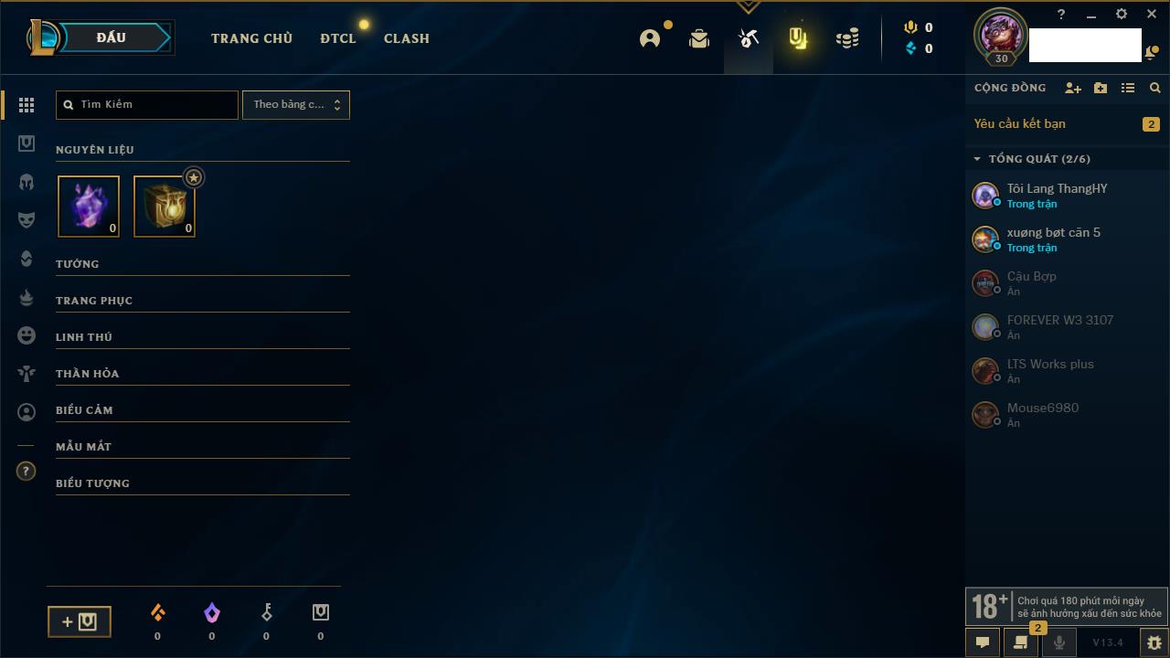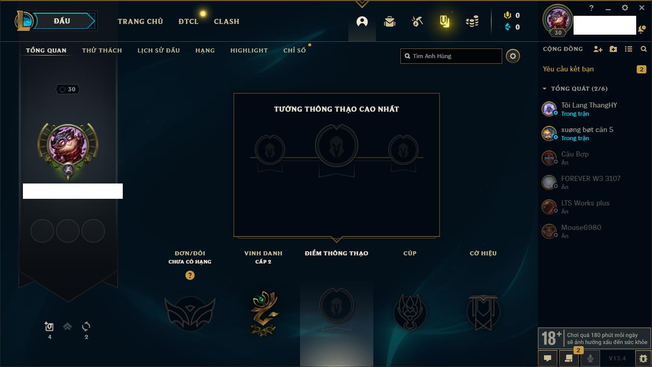 Rank Đơn: Chưa rank mùa nàoKhung: Chưa có khungTướng: 12 - Còn 3853 THXTrang Phục: 2Rank ĐTCL: Chưa RankLinh Thú: 30