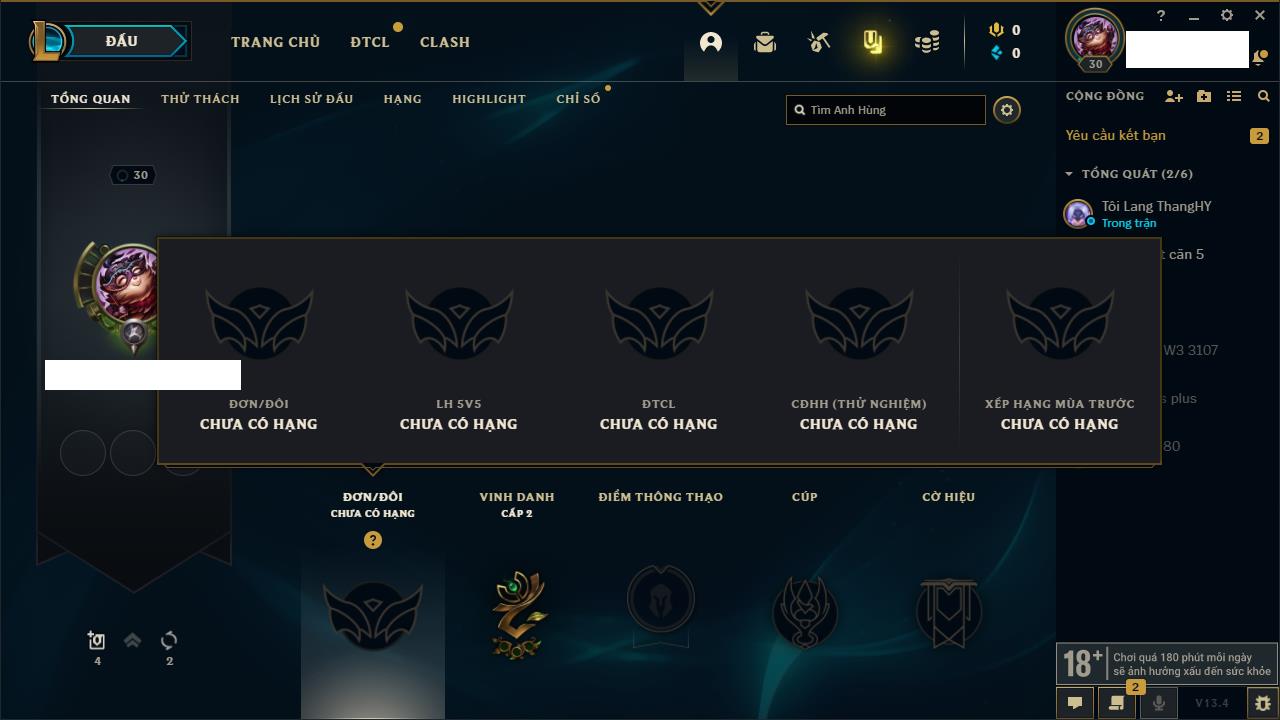Rank Đơn: Vàng IIIKhung: BạcTướng: 56 - Còn 910 THXTrang Phục: 9Rank ĐTCL: Chưa RankLinh Thú: 31