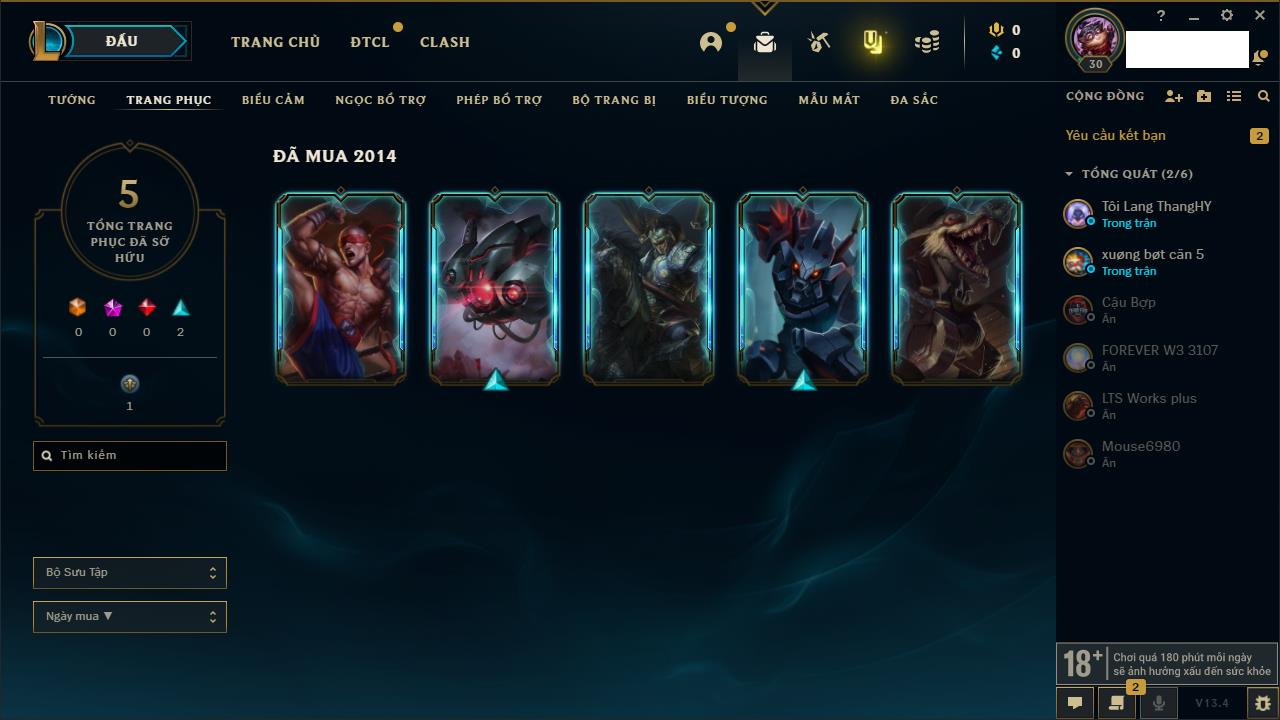 Rank Đơn: Chưa rank mùa nàoKhung: Chưa có khungTướng: 108 - Còn 6515 THXTrang Phục: 23Rank ĐTCL: Chưa RankLinh Thú: 111