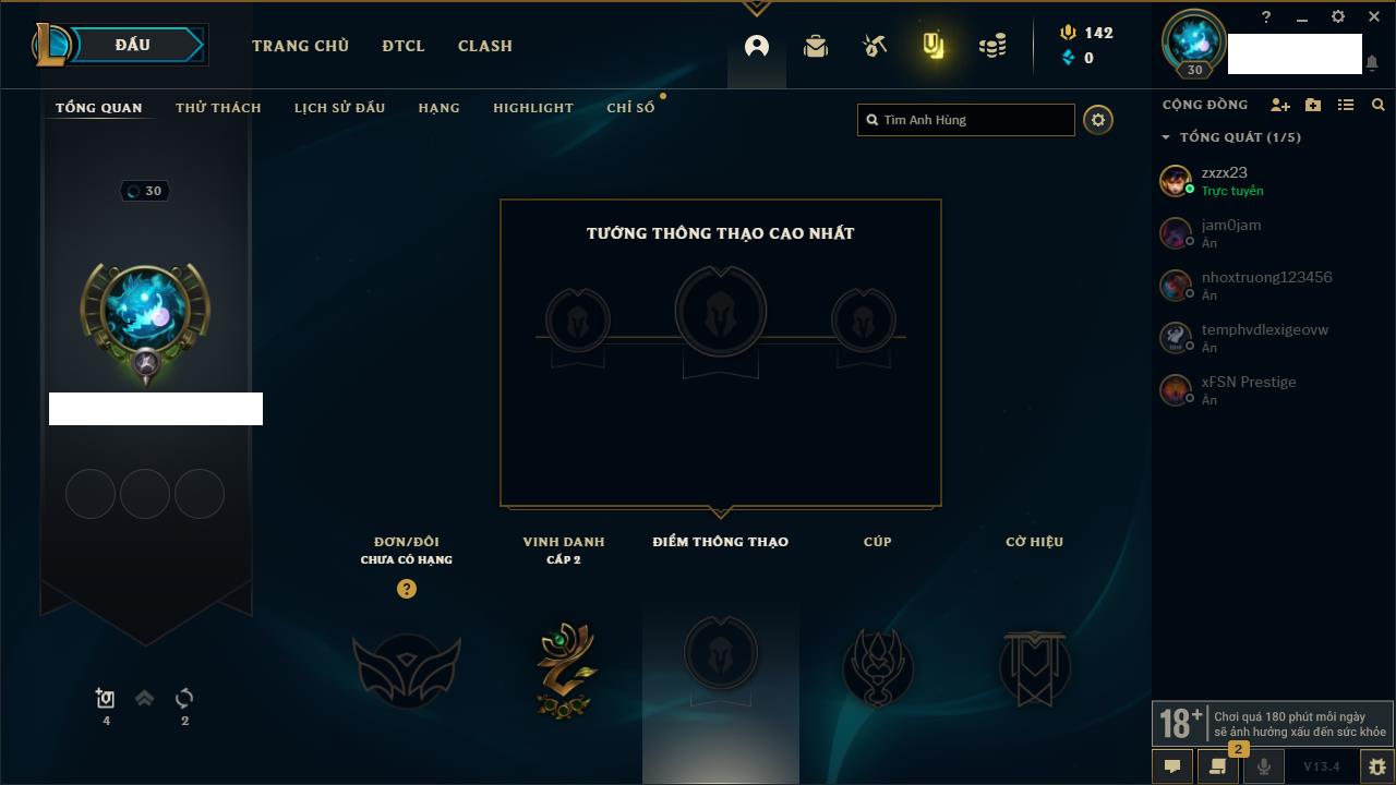 Rank Đơn: Chưa RankKhung: Chưa có khungTướng: 27 - Còn 170 THXTrang Phục: 0Rank ĐTCL: Chưa RankLinh Thú: 33