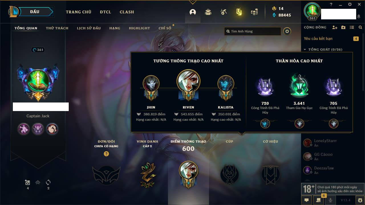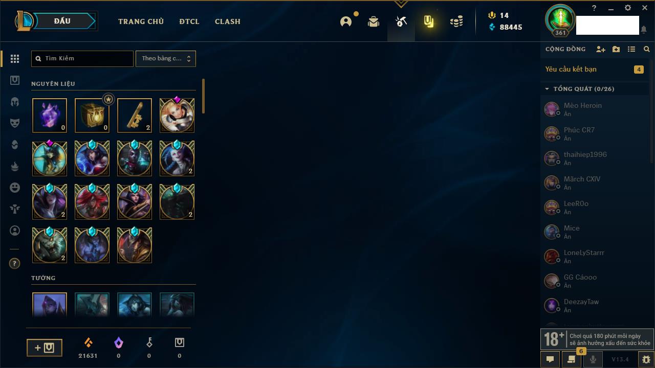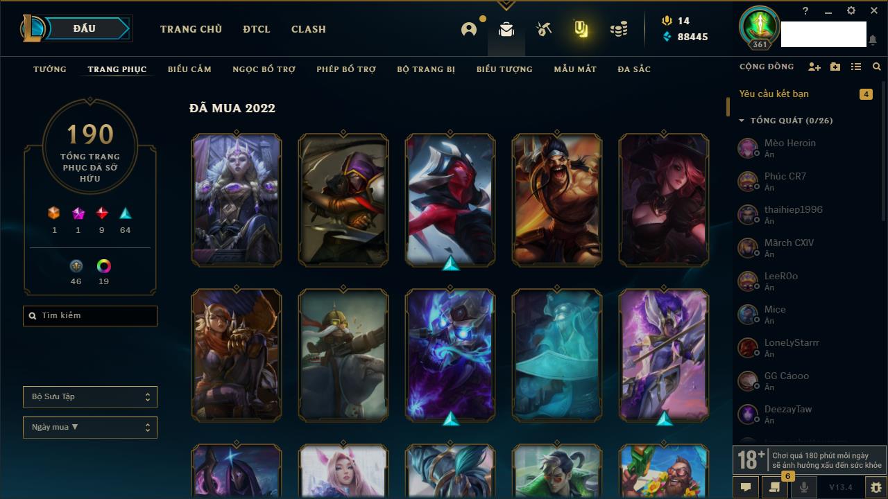 Rank Đơn: Vàng IVKhung: VàngTướng: 171 - Còn 48721 THXTrang Phục: 171Rank ĐTCL: Chưa RankLinh Thú: 27