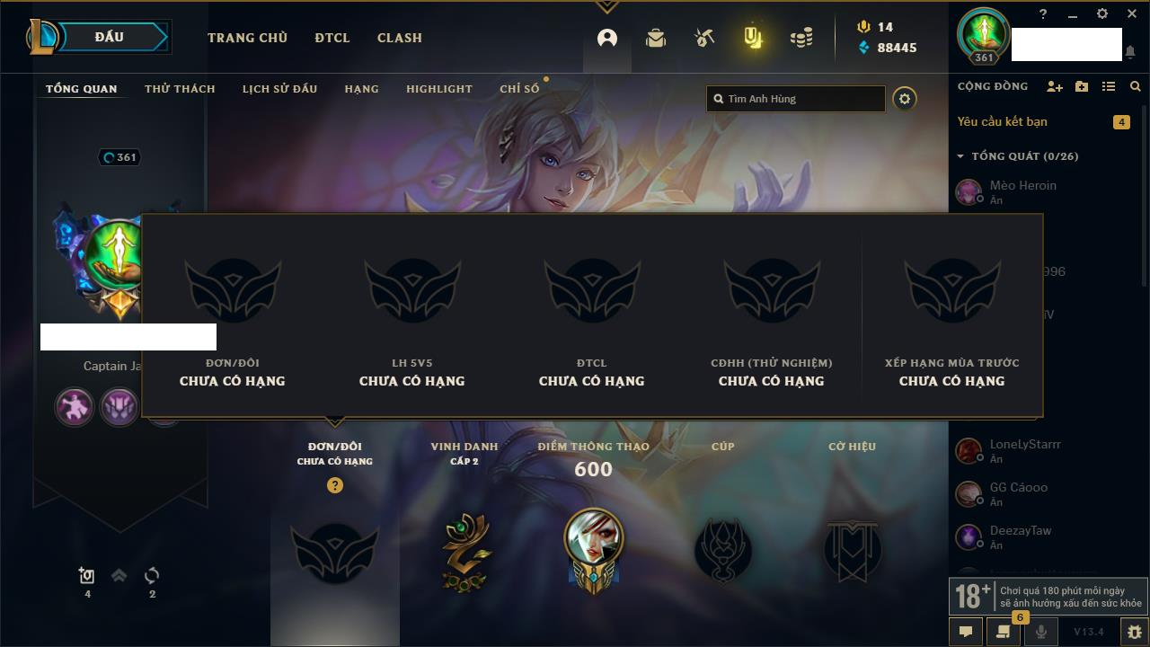 Rank Đơn: Vàng IVKhung: BạcTướng: 166 - Còn 180925 THXTrang Phục: 163Rank ĐTCL: Chưa RankLinh Thú: 67
