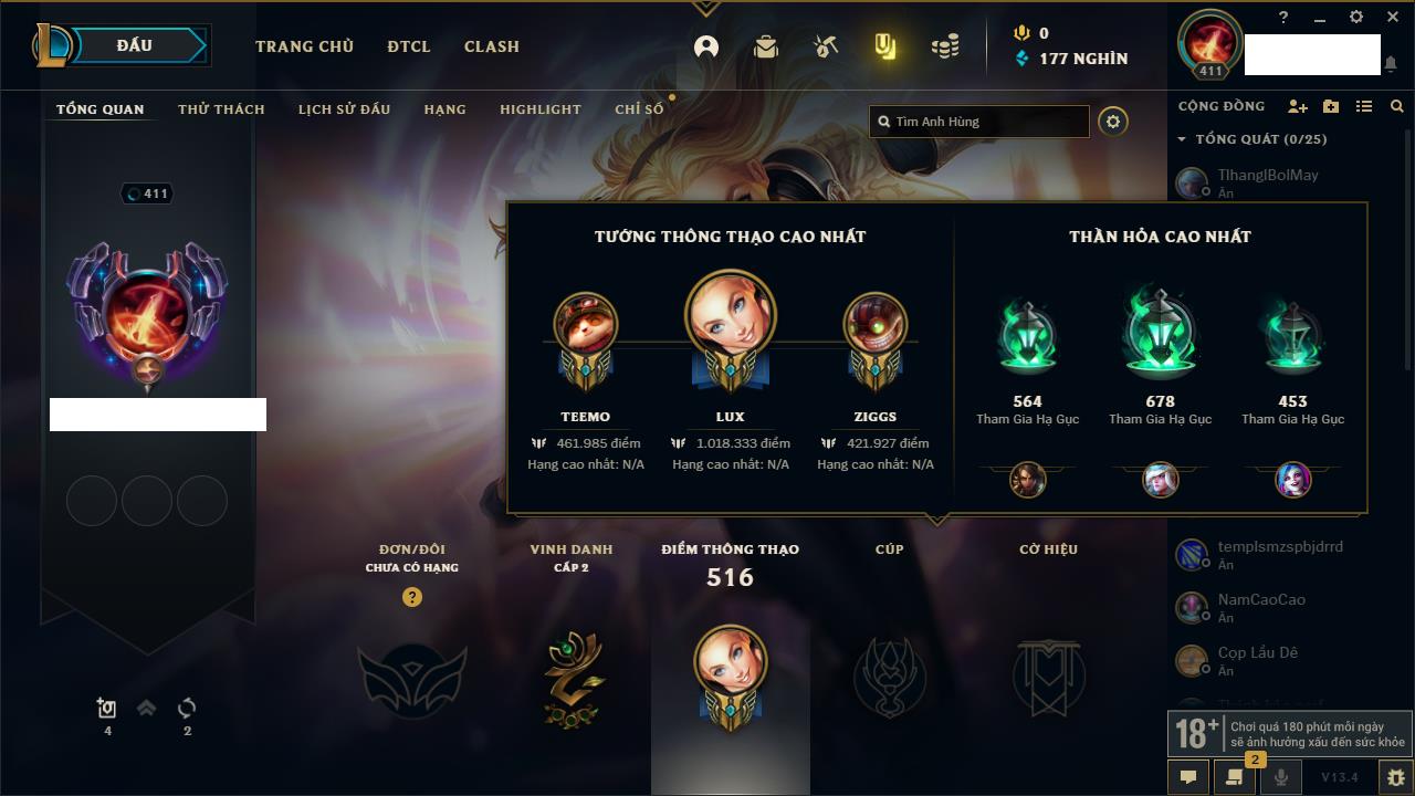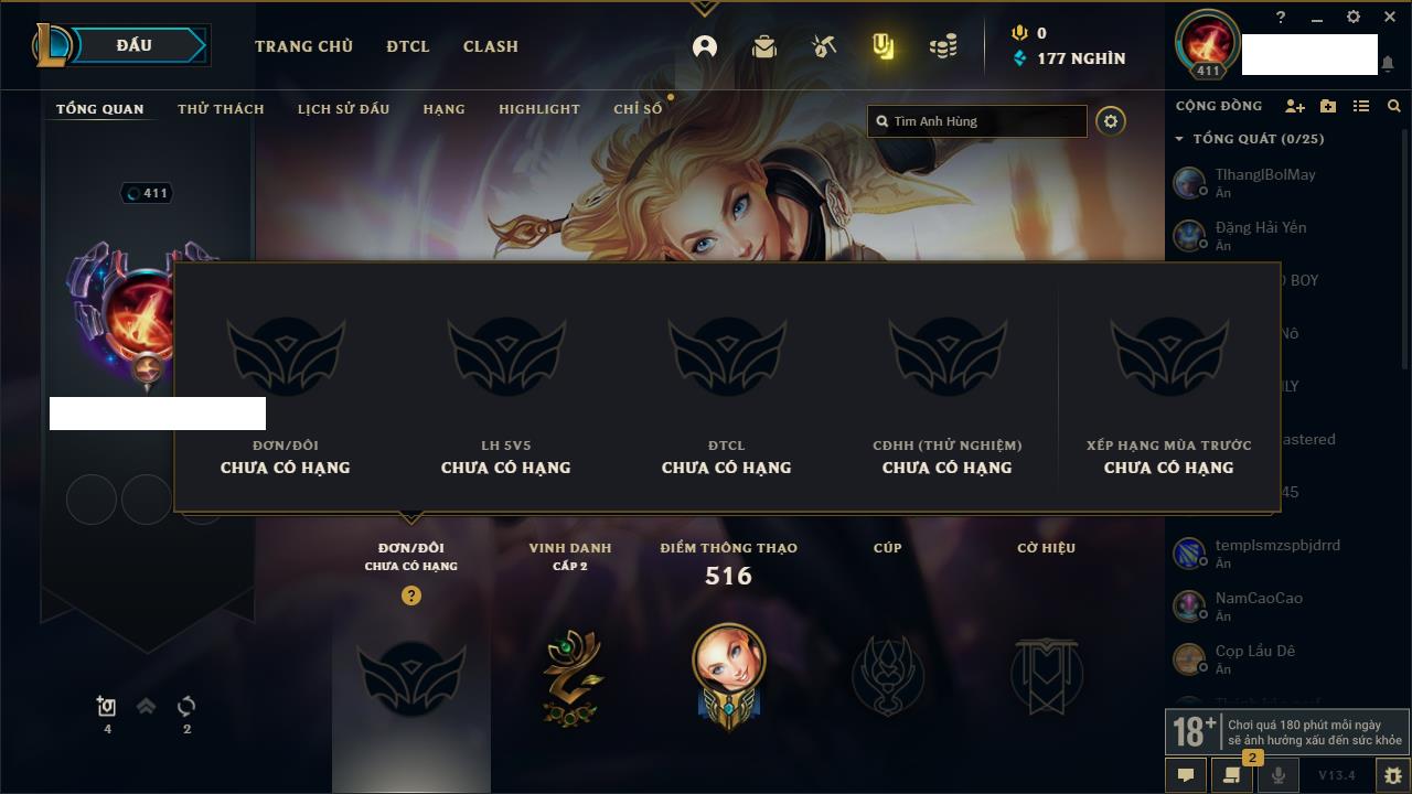 Rank Đơn: Đồng IIKhung: ĐồngTướng: 170 - Còn 66145 THXTrang Phục: 215Rank ĐTCL: Chưa RankLinh Thú: 52