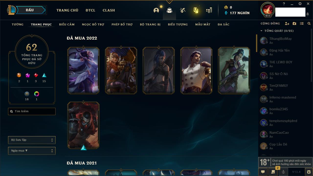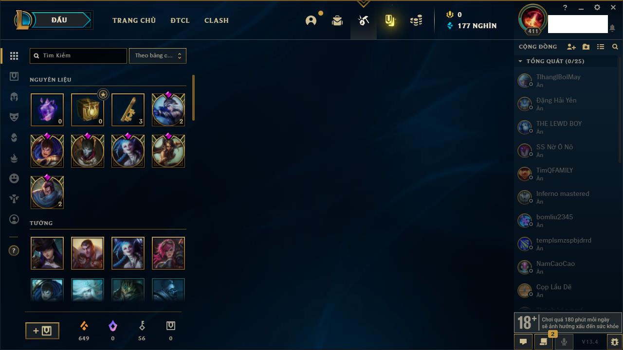 Rank Đơn: Vàng IIIKhung: BạcTướng: 171 - Còn 101359 THXTrang Phục: 88Rank ĐTCL: Kim Cương IVLinh Thú: 200