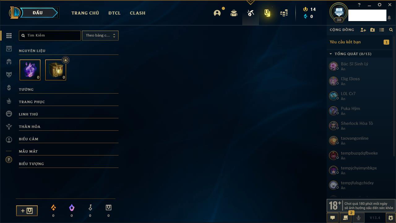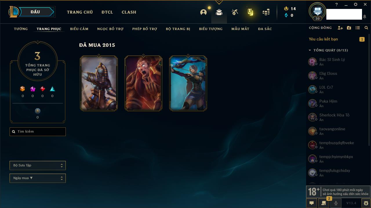 Rank Đơn: Sắt IIIKhung: Chưa có khungTướng: 49 - Còn 11000 THXTrang Phục: 6Rank ĐTCL: Chưa RankLinh Thú: 131