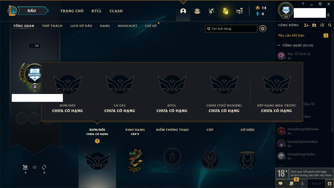 Rank Đơn: Đồng IIIKhung: Chưa có khungTướng: 86 - Còn 14367 THXTrang Phục: 19Rank ĐTCL: Vàng IIILinh Thú: 95