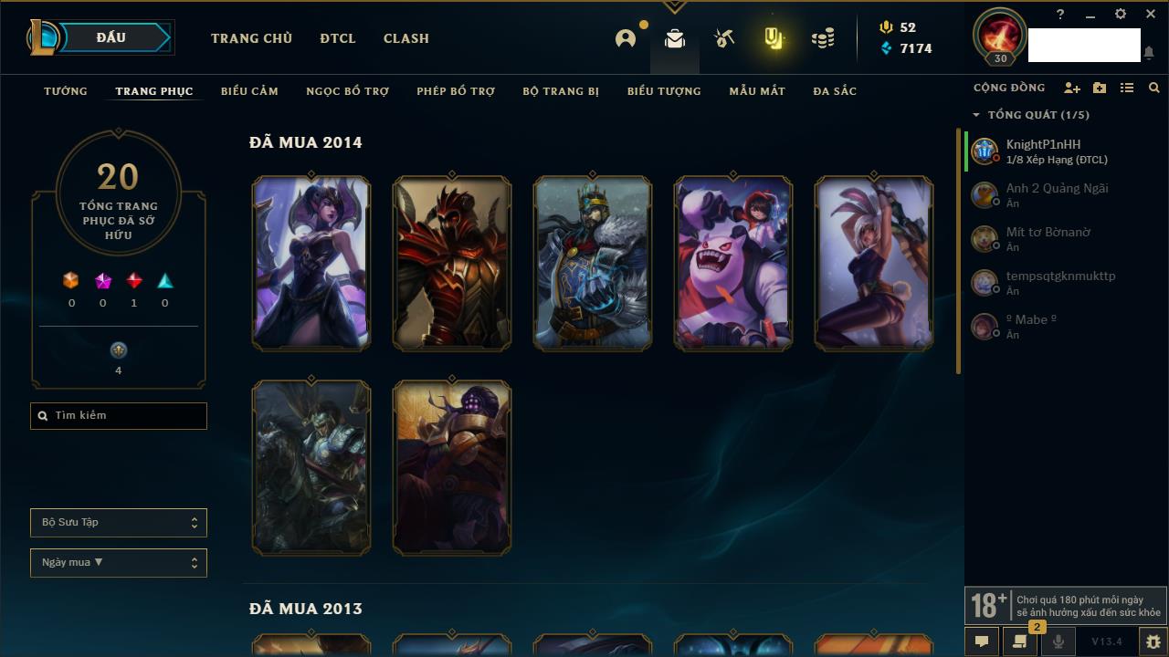 Rank Đơn: Vàng IKhung: Bạch kimTướng: 172 - Còn 108407 THXTrang Phục: 237Rank ĐTCL: Chưa RankLinh Thú: 44