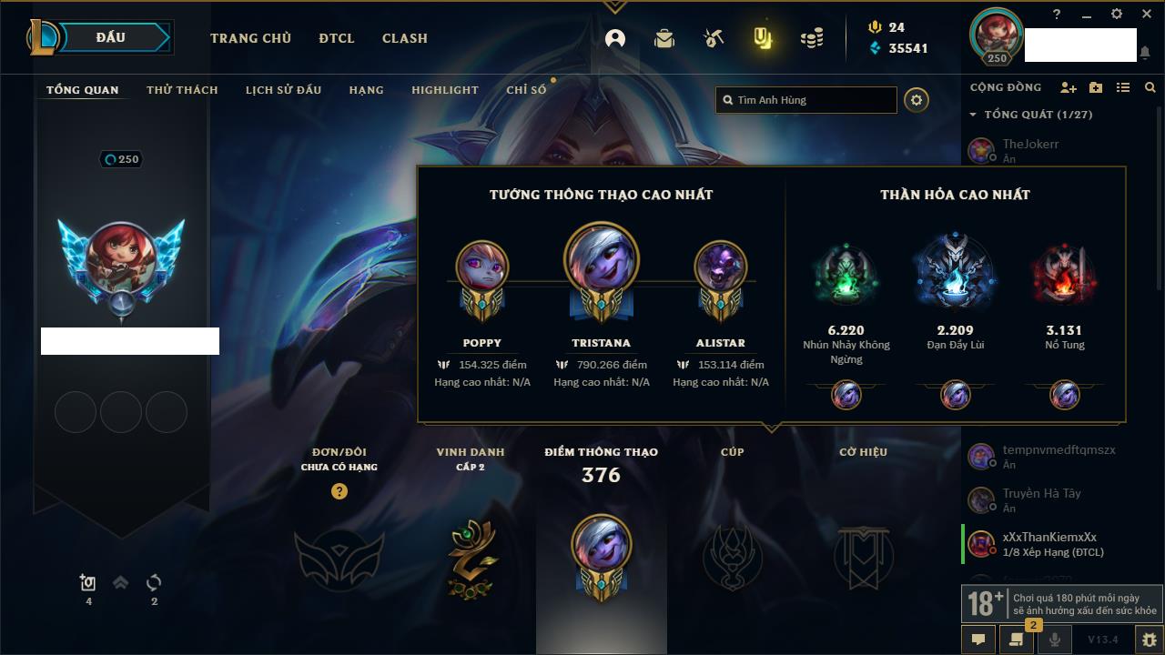 Rank Đơn: Vàng IVKhung: VàngTướng: 171 - Còn 48721 THXTrang Phục: 171Rank ĐTCL: Chưa RankLinh Thú: 27