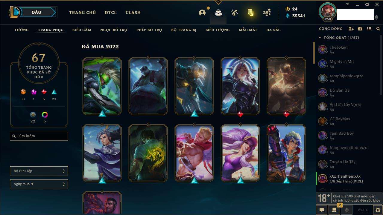Rank Đơn: Vàng IVKhung: BạcTướng: 166 - Còn 180925 THXTrang Phục: 163Rank ĐTCL: Chưa RankLinh Thú: 67