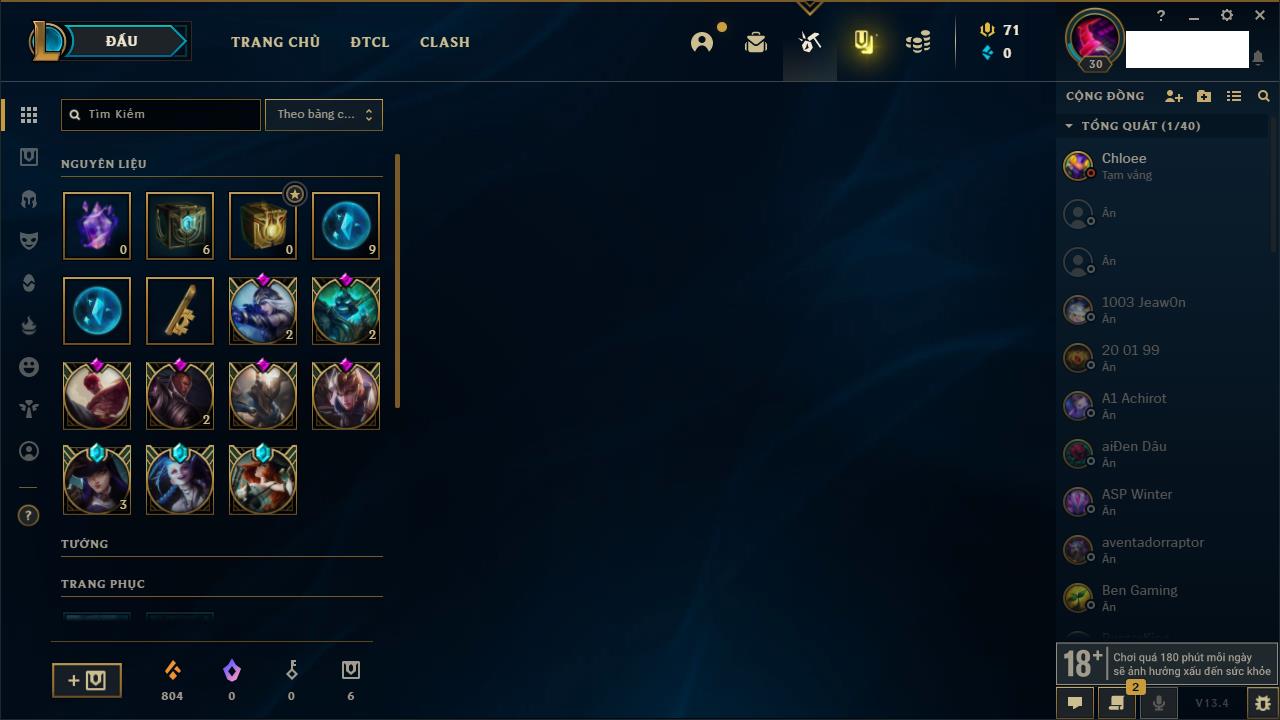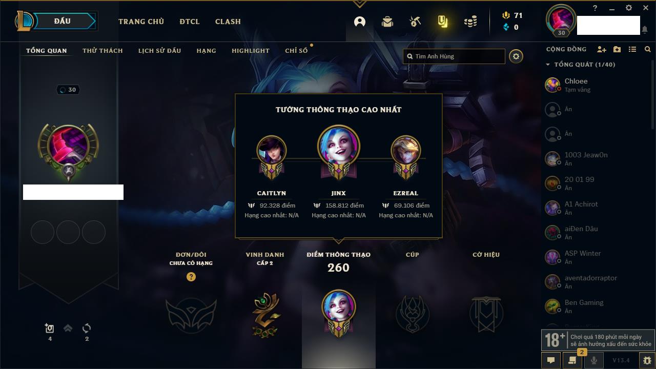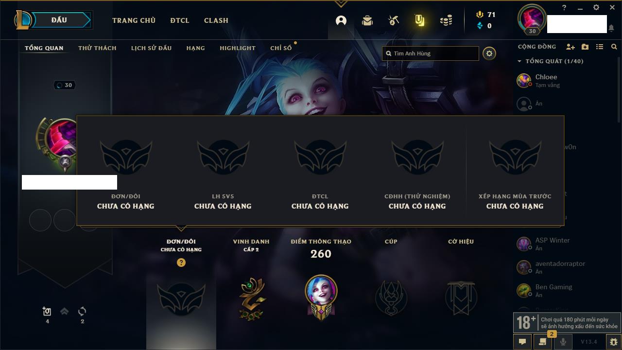 Rank Đơn: Vàng IKhung: BạcTướng: 171 - Còn 60584 THXTrang Phục: 286Rank ĐTCL: Vàng IIILinh Thú: 117