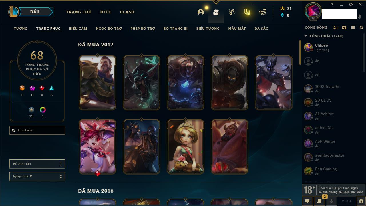 Rank Đơn: Vàng IIIKhung: VàngTướng: 171 - Còn 88128 THXTrang Phục: 329Rank ĐTCL: Chưa RankLinh Thú: 41