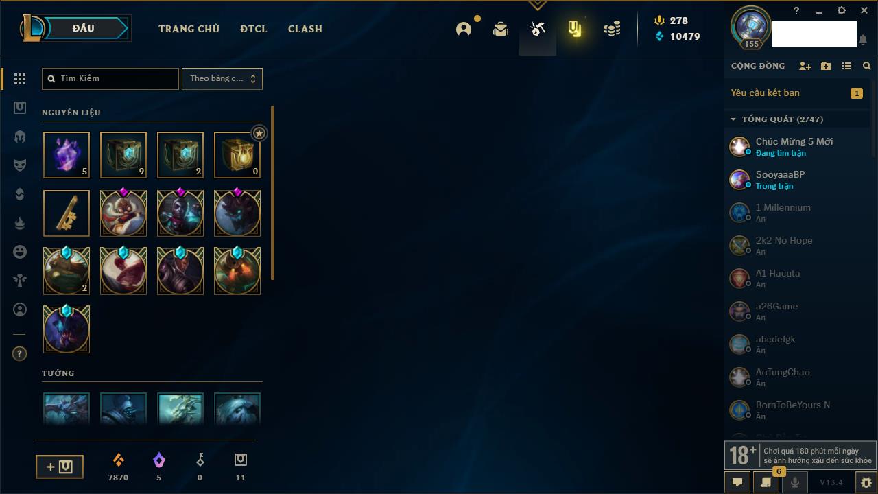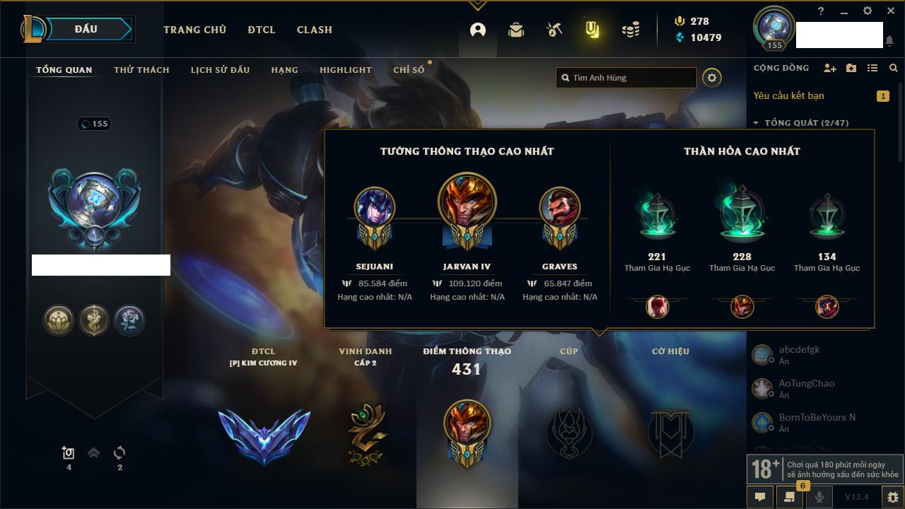 Rank Đơn: Bạc IIKhung: Chưa có khungTướng: 145 - Còn 12230 THXTrang Phục: 183Rank ĐTCL: Chưa RankLinh Thú: 71