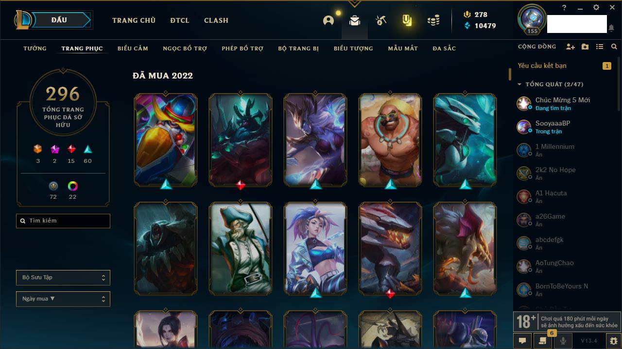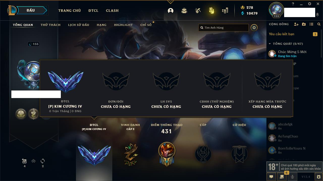 Rank Đơn: Chưa RankKhung: Chưa có khungTướng: 169 - Còn 43188 THXTrang Phục: 205Rank ĐTCL: Chưa RankLinh Thú: 259