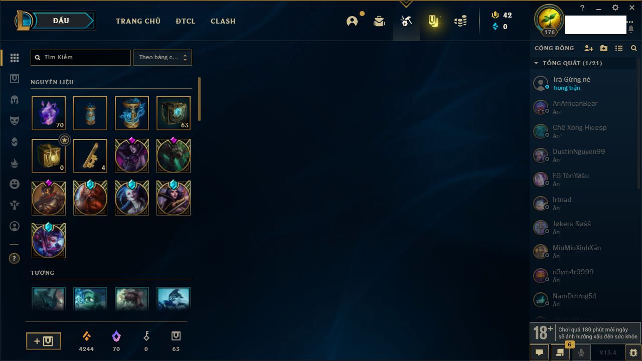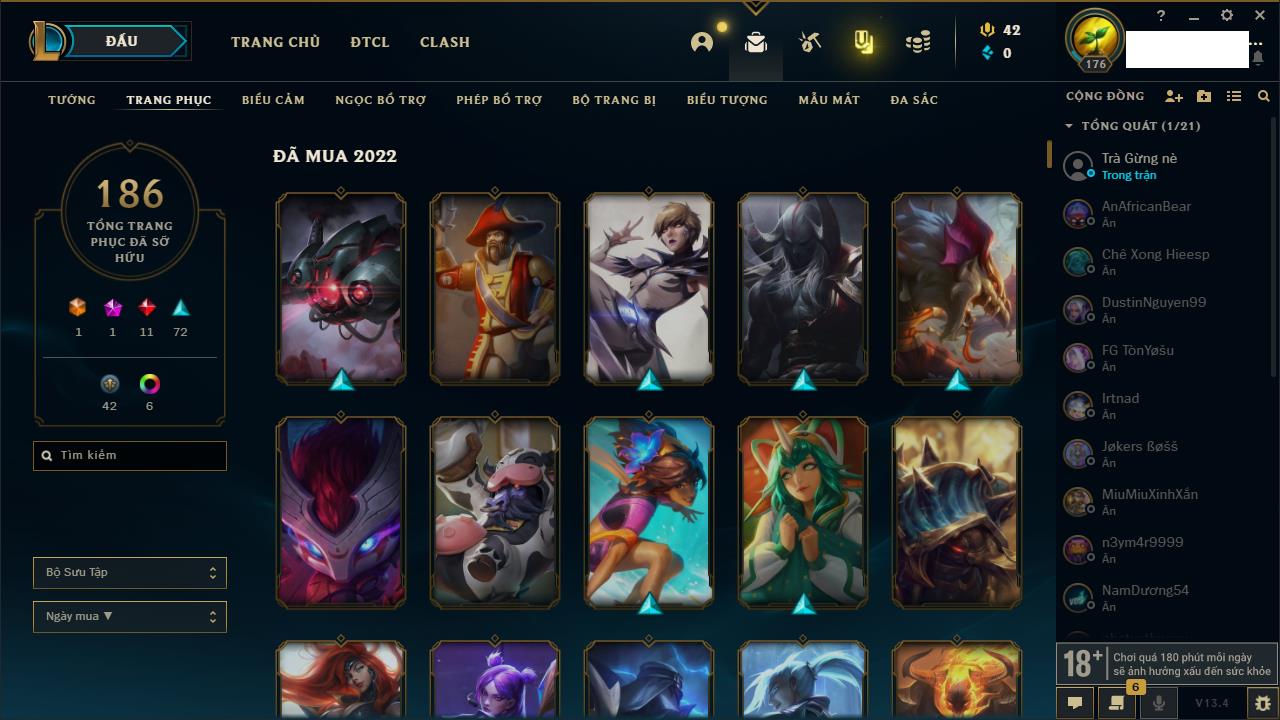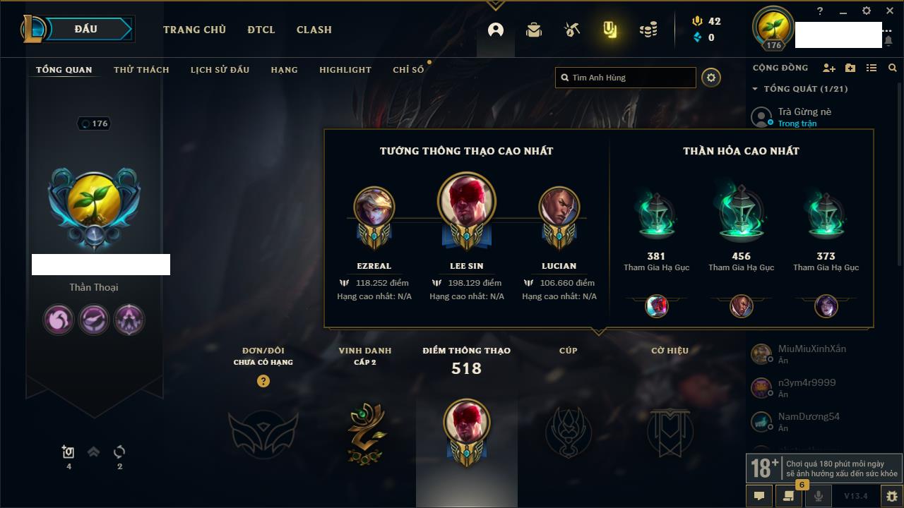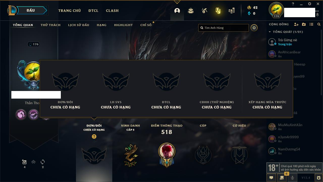 Rank Đơn: Đồng IIKhung: Chưa có khungTướng: 170 - Còn 56487 THXTrang Phục: 90Rank ĐTCL: Chưa RankLinh Thú: 129