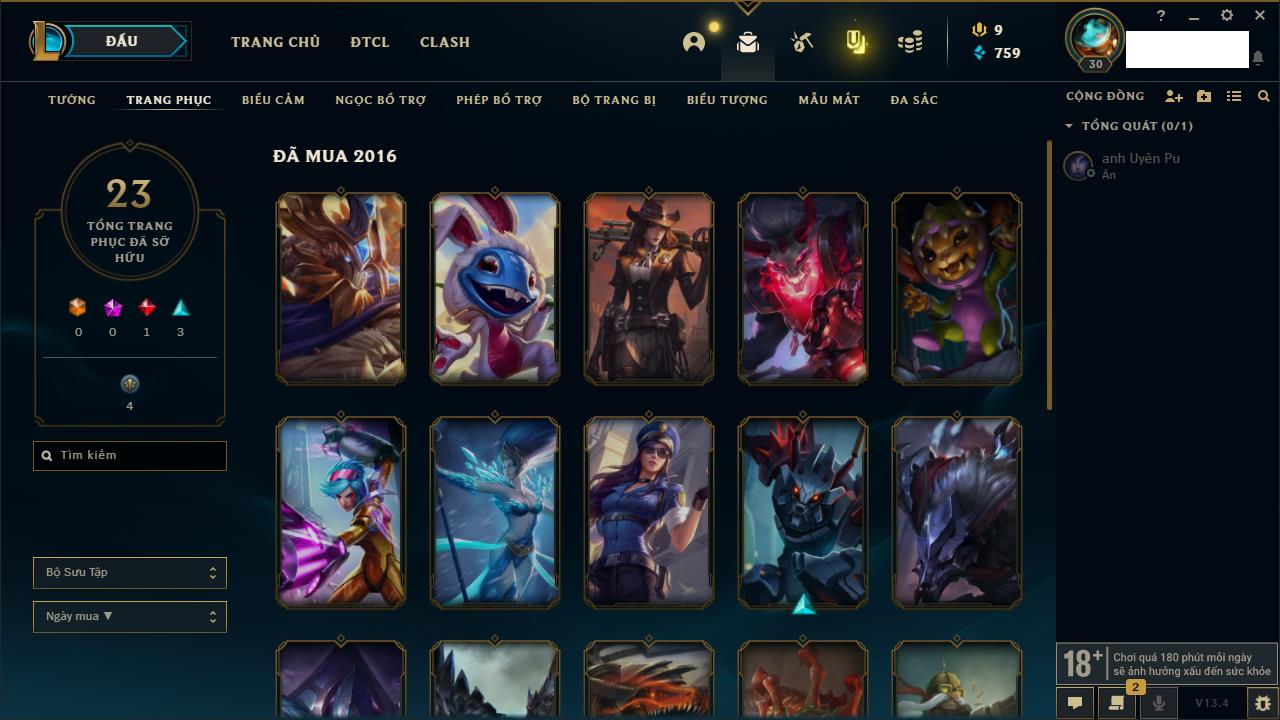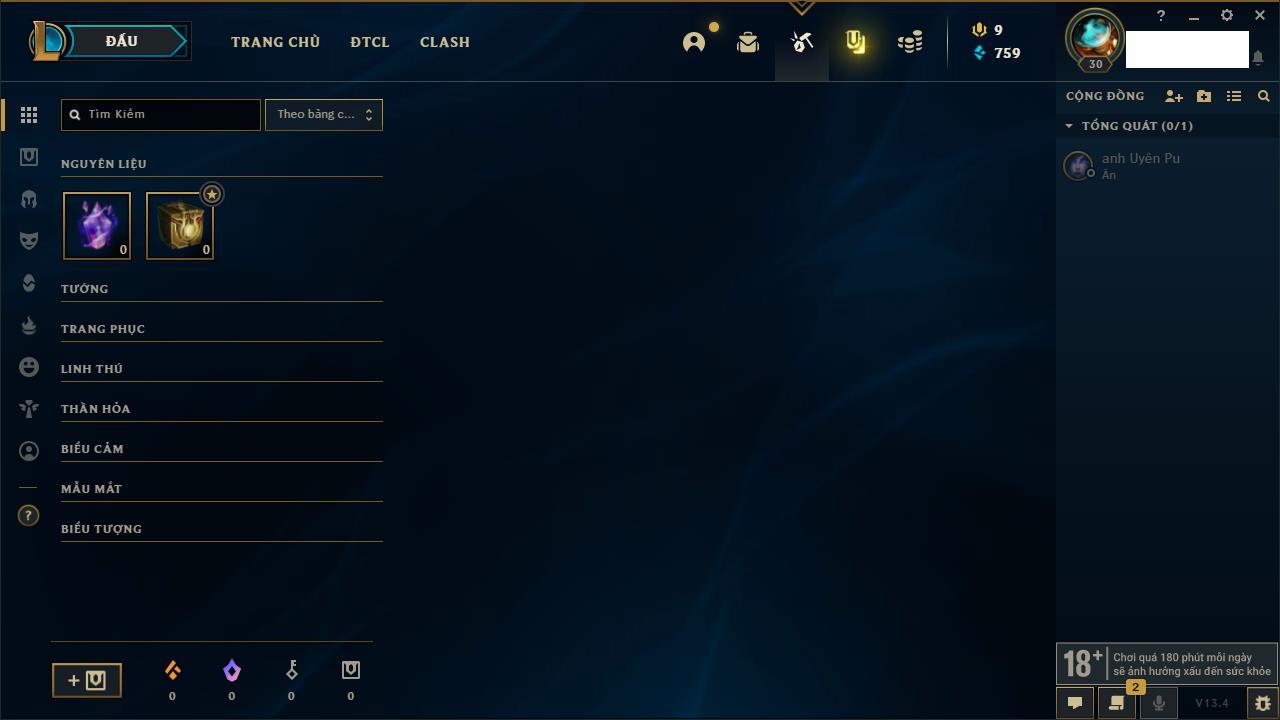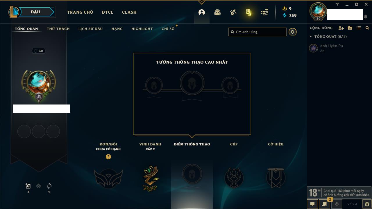 Rank Đơn: Đồng IV Khung: Chưa có khung Tướng: 171 - Còn 88838 THX Trang Phục: 103 Rank ĐTCL: Vàng IV Linh Thú: 139