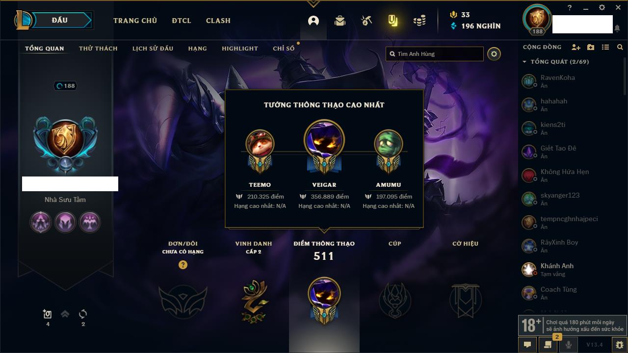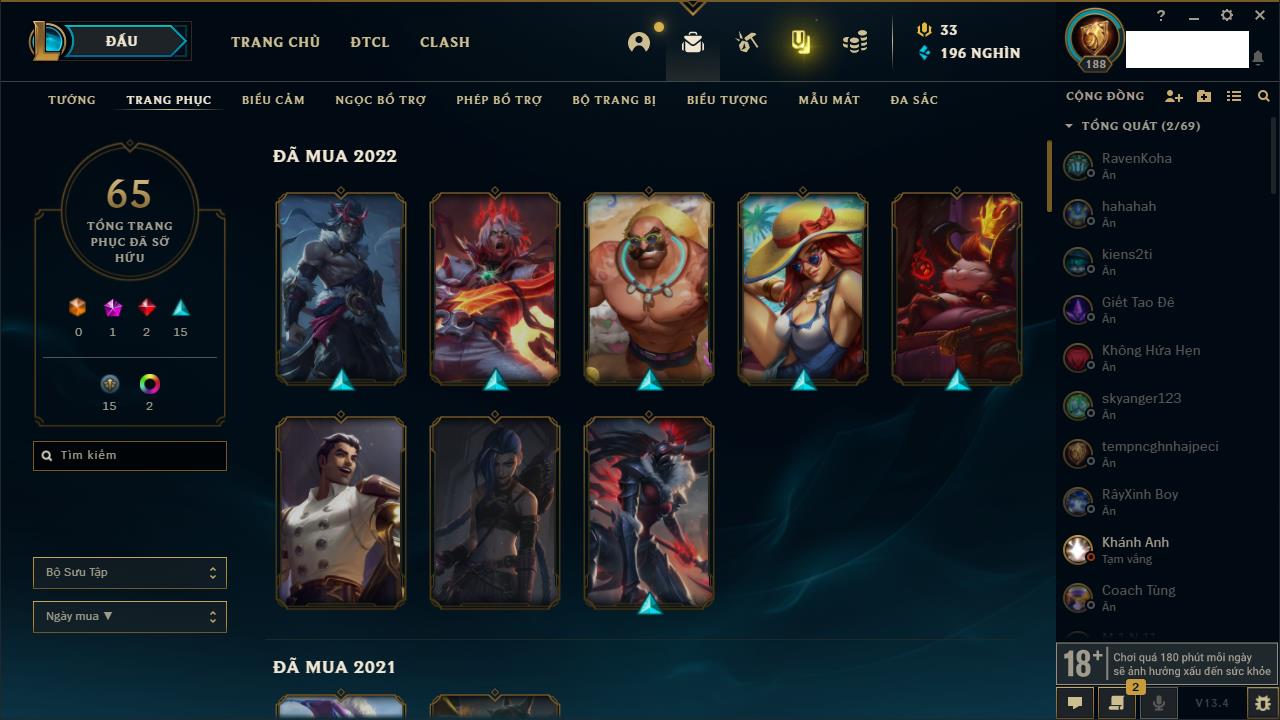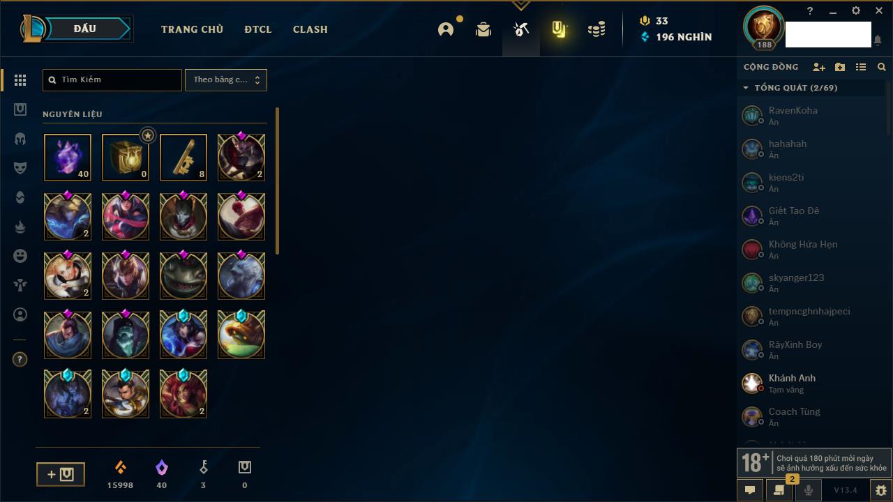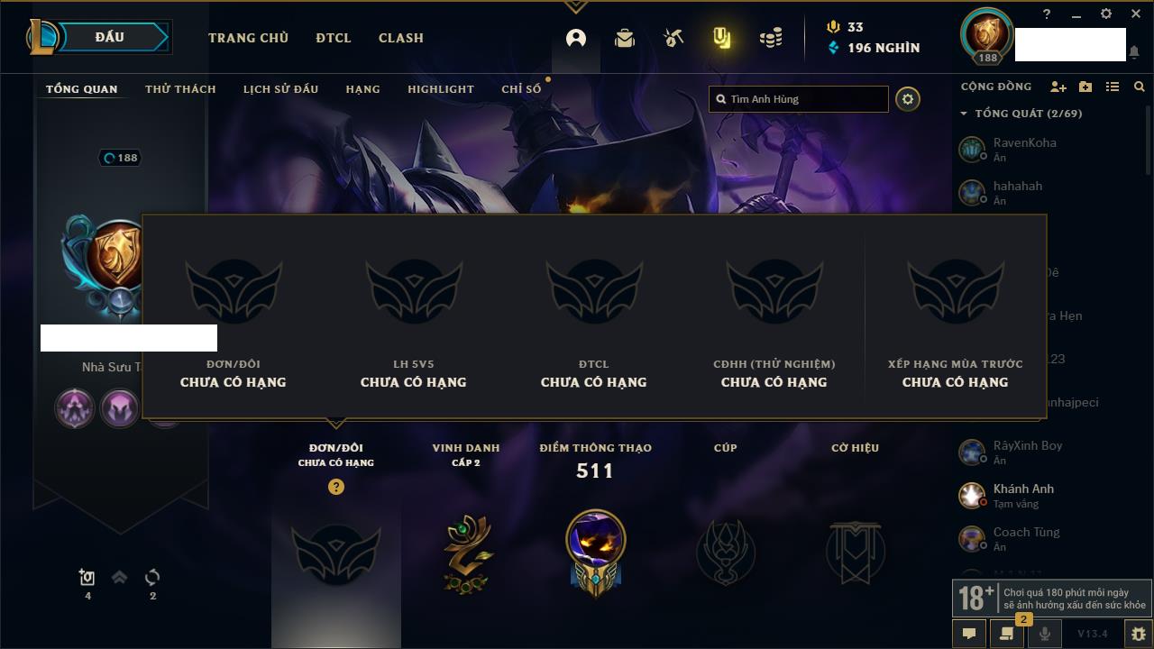 Rank Đơn: Vàng IIIKhung: BạcTướng: 171 - Còn 101359 THXTrang Phục: 88Rank ĐTCL: Kim Cương IVLinh Thú: 200
