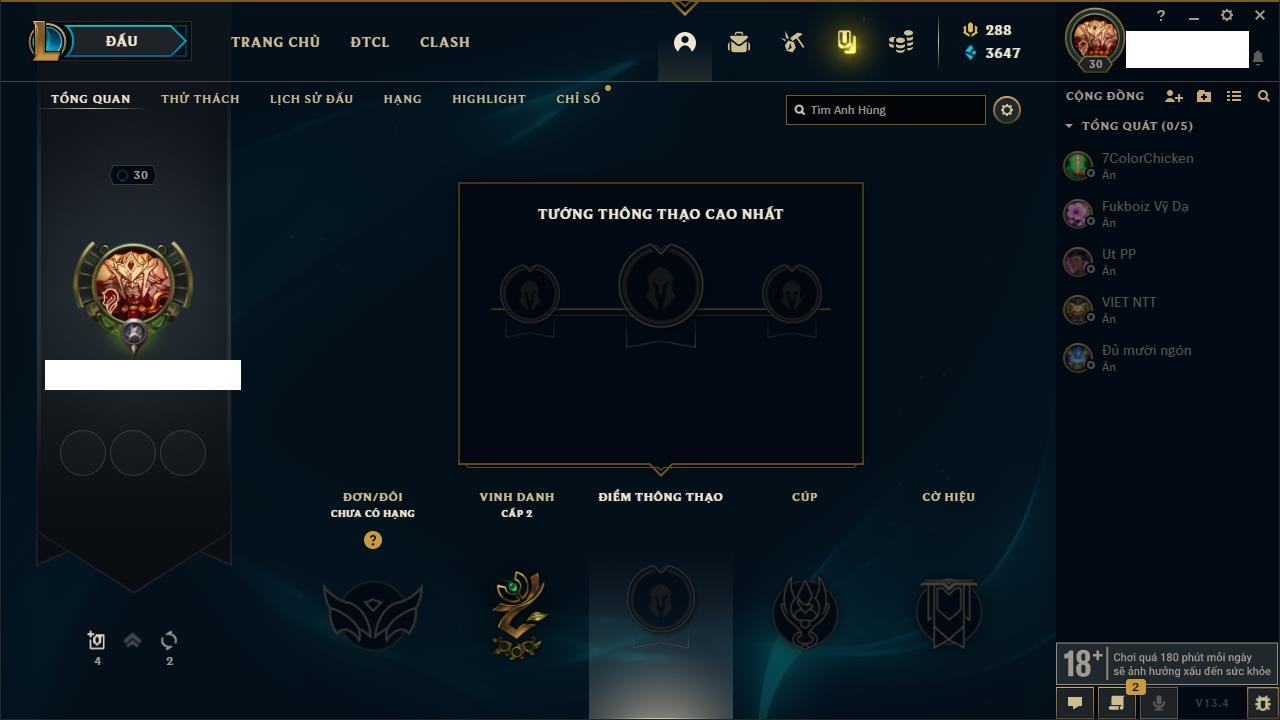 Rank Đơn: Bạc IIIKhung: BạcTướng: 140 - Còn 1624 THXTrang Phục: 36Rank ĐTCL: Chưa RankLinh Thú: 118