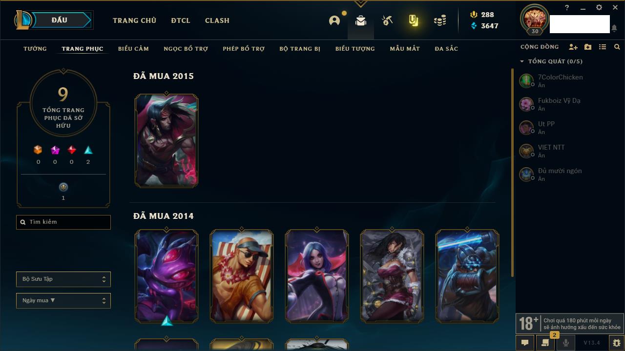 Rank Đơn: Bạch Kim IIIKhung: Bạch kimTướng: 59 - Còn 20316 THXTrang Phục: 29Rank ĐTCL: Chưa RankLinh Thú: 3