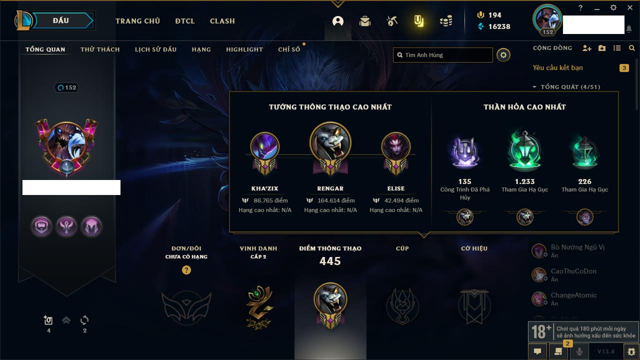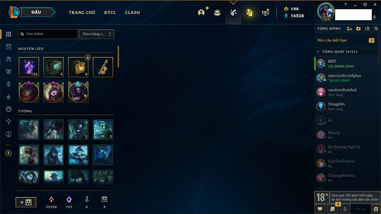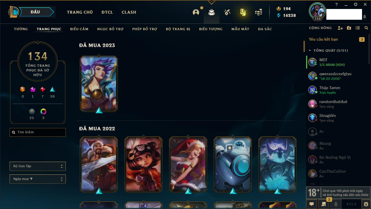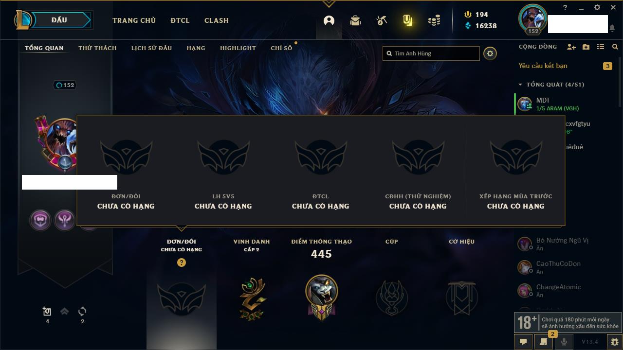 Rank Đơn: Vàng IIIKhung: BạcTướng: 171 - Còn 101359 THXTrang Phục: 88Rank ĐTCL: Kim Cương IVLinh Thú: 200