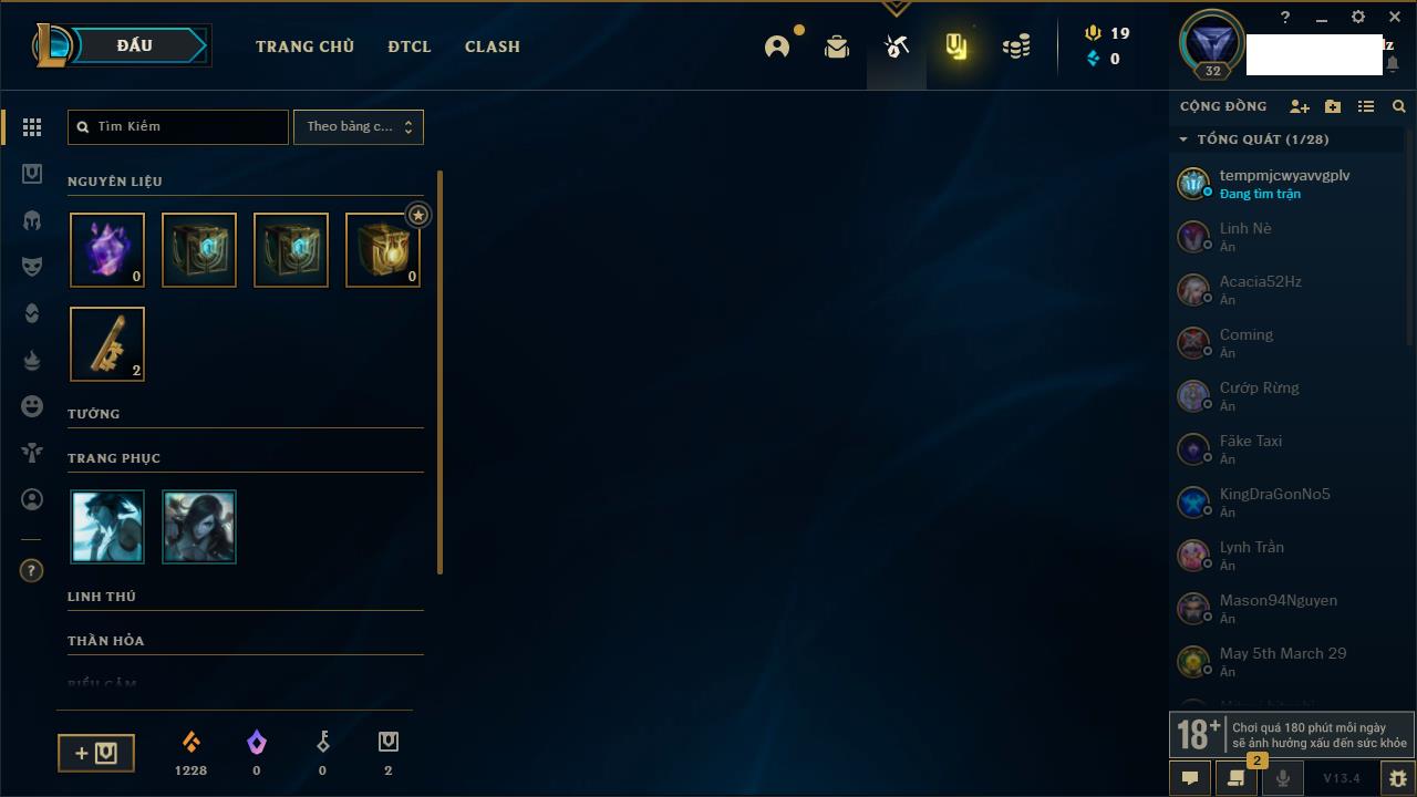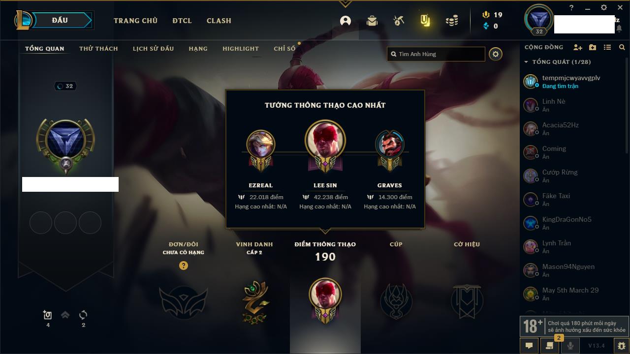 Rank Đơn: Bạch Kim IVKhung: VàngTướng: 171 - Còn 130280 THXTrang Phục: 226Rank ĐTCL: Kim Cương IVLinh Thú: 183