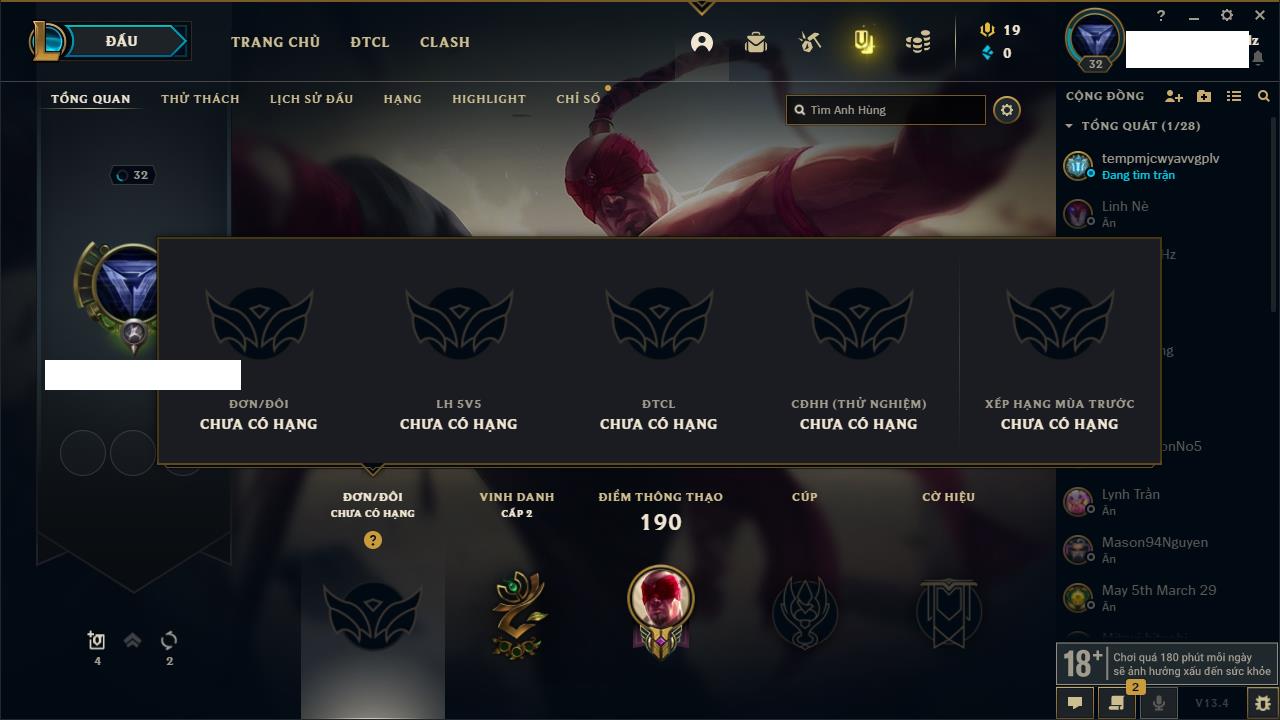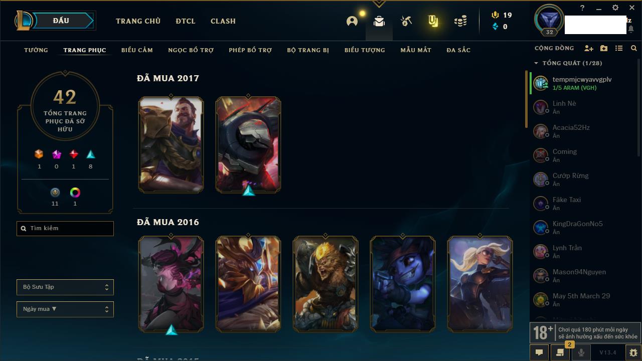 Rank Đơn: Vàng IIKhung: VàngTướng: 171 - Còn 219803 THXTrang Phục: 254Rank ĐTCL: Chưa RankLinh Thú: 78