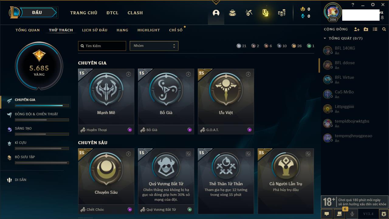 Rank Đơn: Bạc IIKhung: Bạch kimTướng: 169 - Còn 81813 THXTrang Phục: 301Rank ĐTCL: Chưa RankLinh Thú: 140