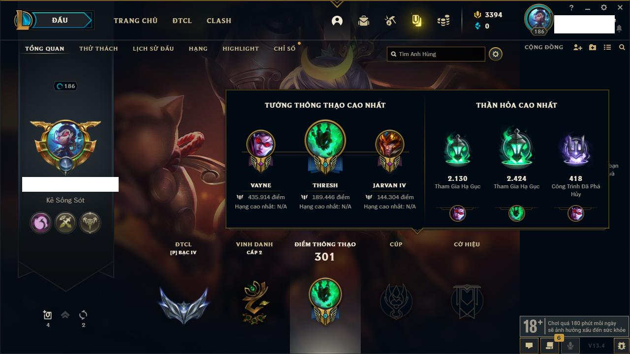 Rank Đơn: Bạc IIKhung: Bạch kimTướng: 169 - Còn 81813 THXTrang Phục: 301Rank ĐTCL: Chưa RankLinh Thú: 140
