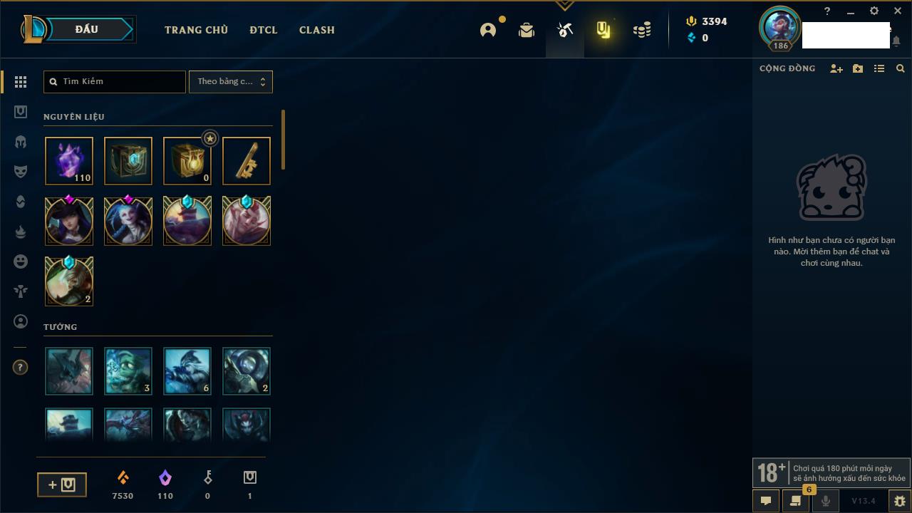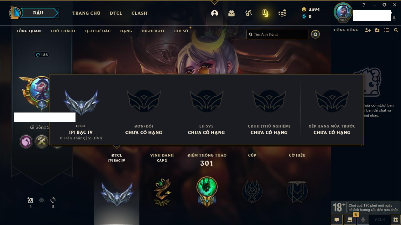 Rank Đơn: Sắt IVKhung: SắtTướng: 171 - Còn 231744 THXTrang Phục: 376Rank ĐTCL: Bạch Kim IILinh Thú: 120