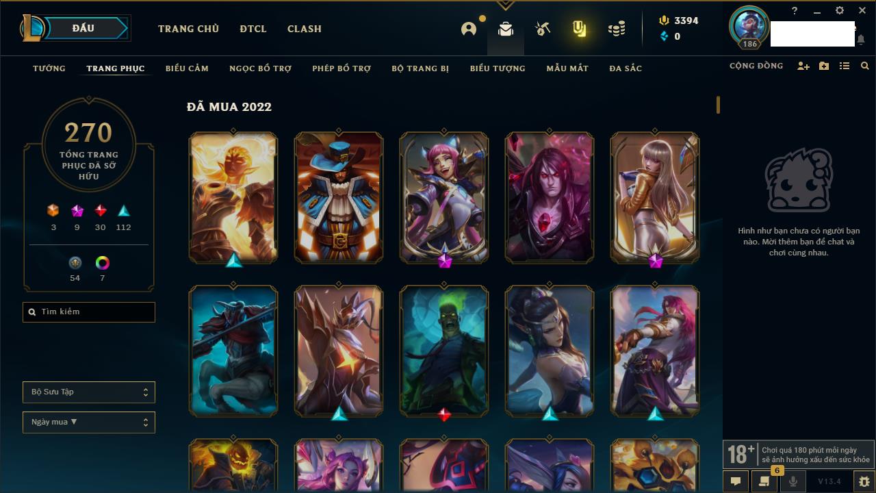 Rank Đơn: Chưa rank mùa nàoKhung: Chưa có khungTướng: 159 - Còn 34939 THXTrang Phục: 59Rank ĐTCL: Chưa RankLinh Thú: 325