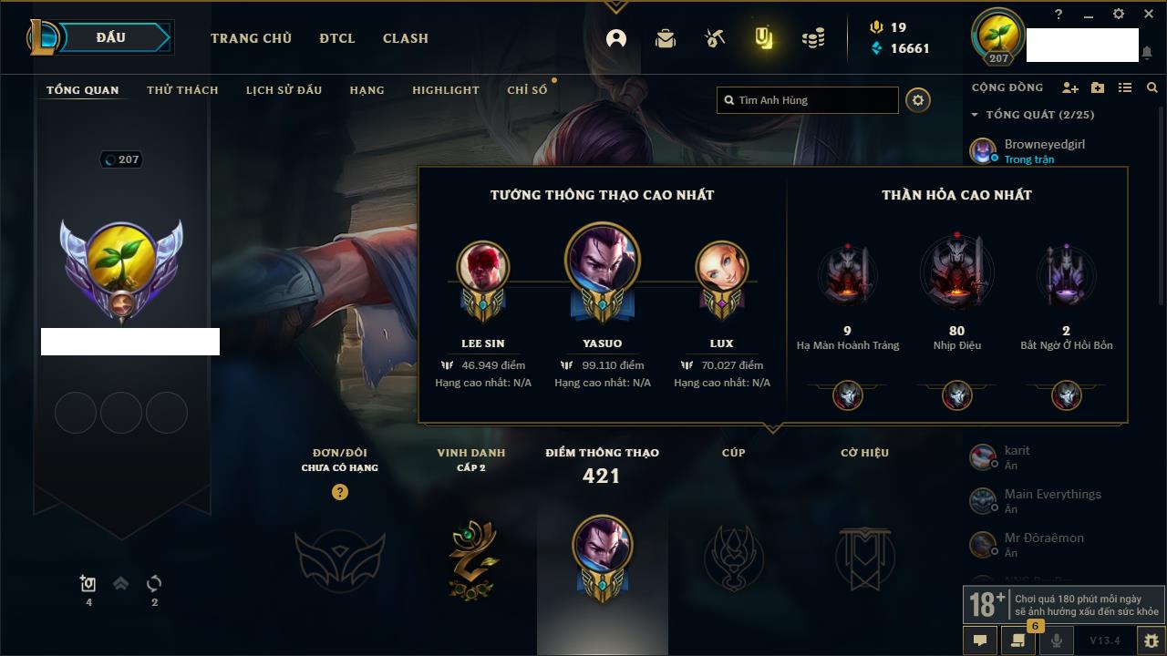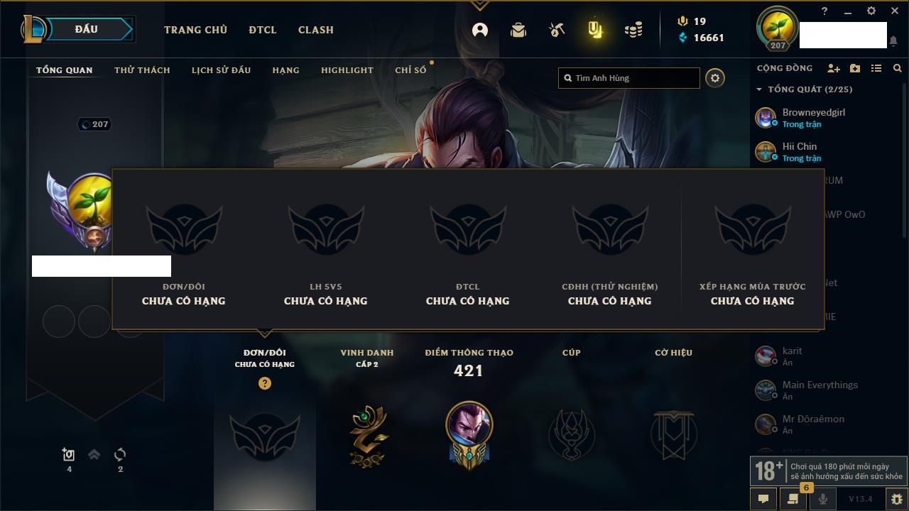 Rank Đơn: Vàng IIKhung: Bạch kimTướng: 172 - Còn 123420 THXTrang Phục: 231Rank ĐTCL: Bạch Kim IVLinh Thú: 213
