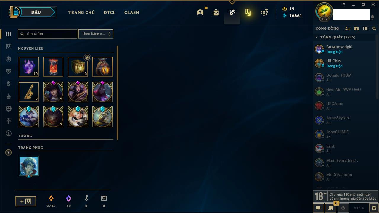 Rank Đơn: Vàng IIIKhung: VàngTướng: 172 - Còn 200315 THXTrang Phục: 87Rank ĐTCL: Chưa RankLinh Thú: 136