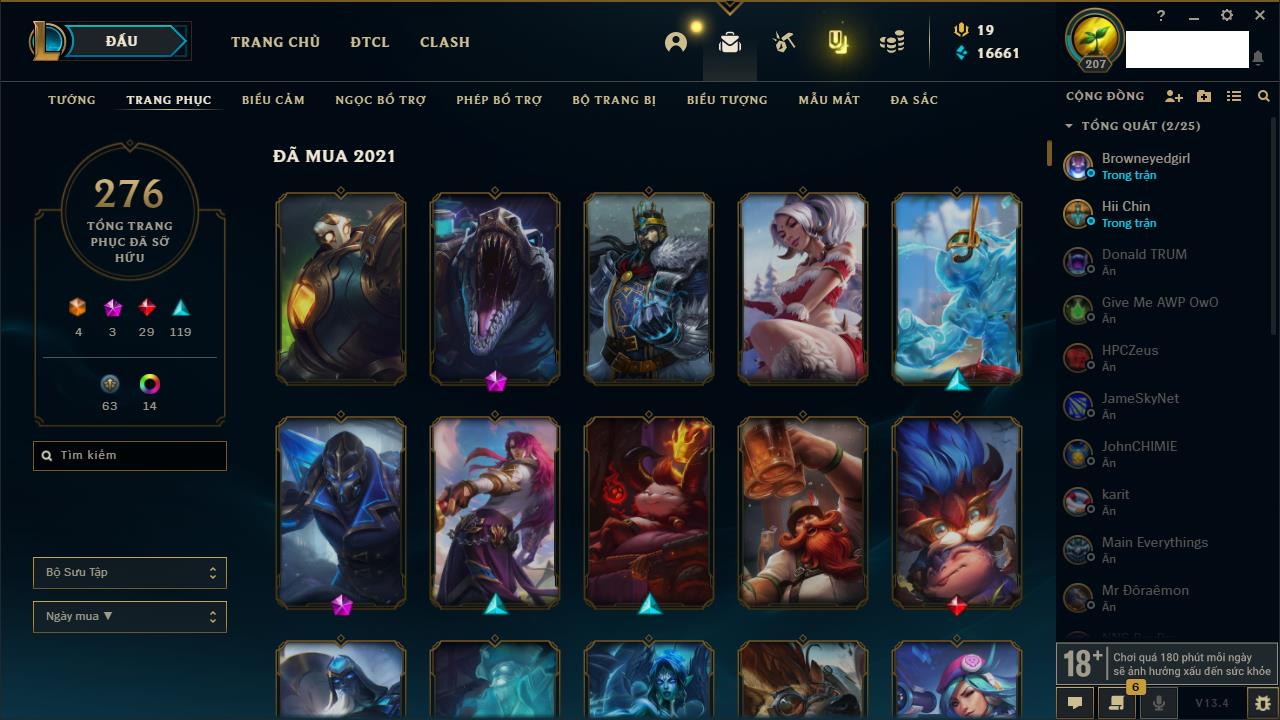Rank Đơn: Bạch Kim IVKhung: VàngTướng: 170 - Còn 34137 THXTrang Phục: 209Rank ĐTCL: Chưa RankLinh Thú: 108