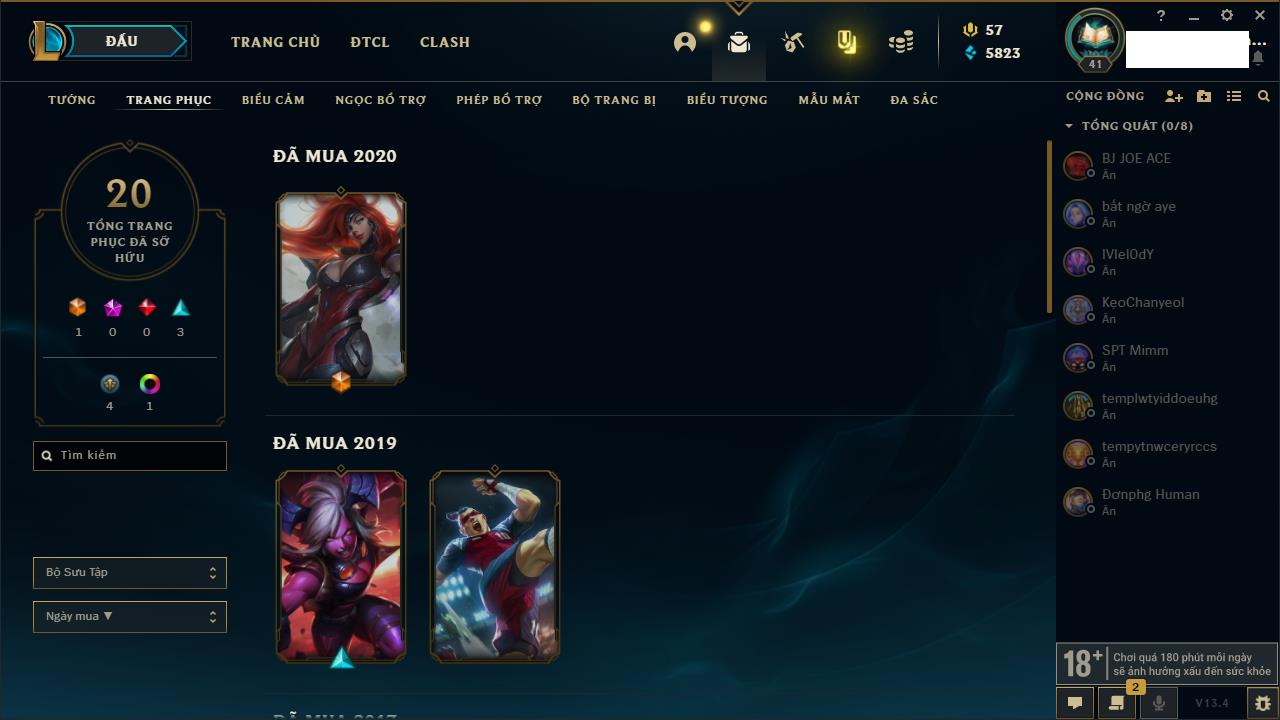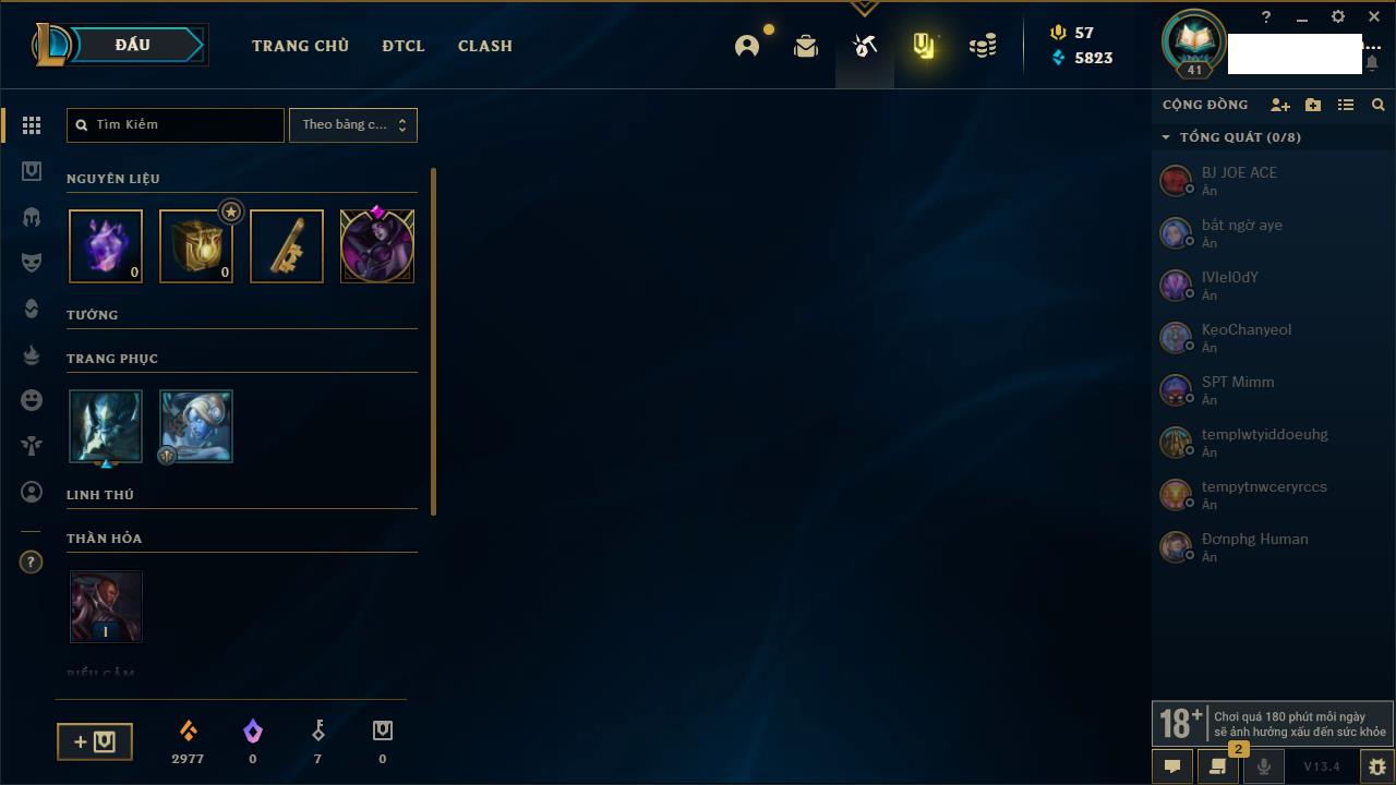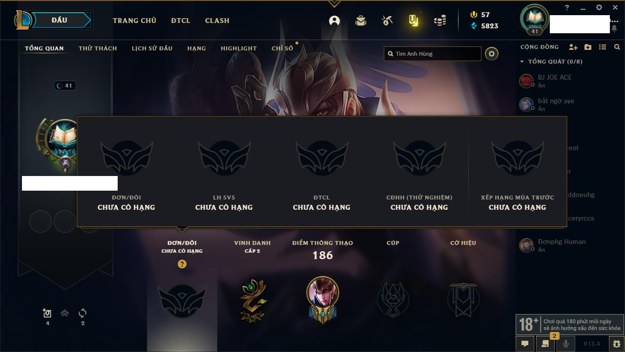 Rank Đơn: Chưa RankKhung: Chưa có khungTướng: 165 - Còn 3214 THXTrang Phục: 160Rank ĐTCL: Chưa RankLinh Thú: 28