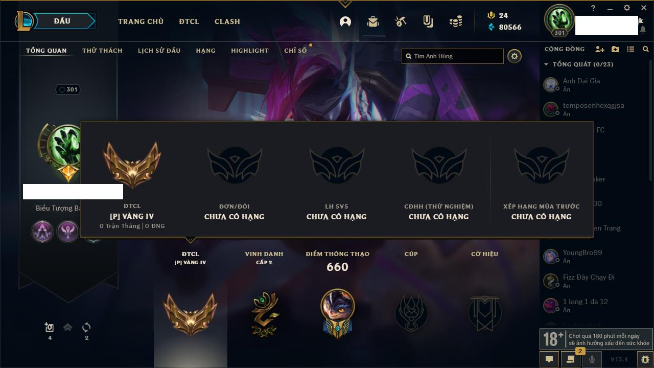 Rank Đơn: Chưa RankKhung: Chưa có khungTướng: 160 - Còn 21398 THXTrang Phục: 380Rank ĐTCL: Chưa RankLinh Thú: 27