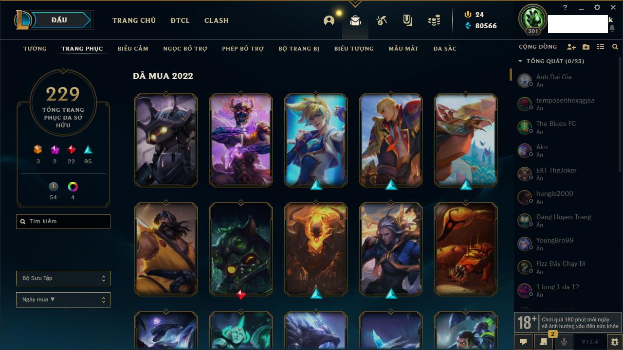 Rank Đơn: Chưa RankKhung: Chưa có khungTướng: 171 - Còn 75227 THXTrang Phục: 425Rank ĐTCL: Chưa RankLinh Thú: 201